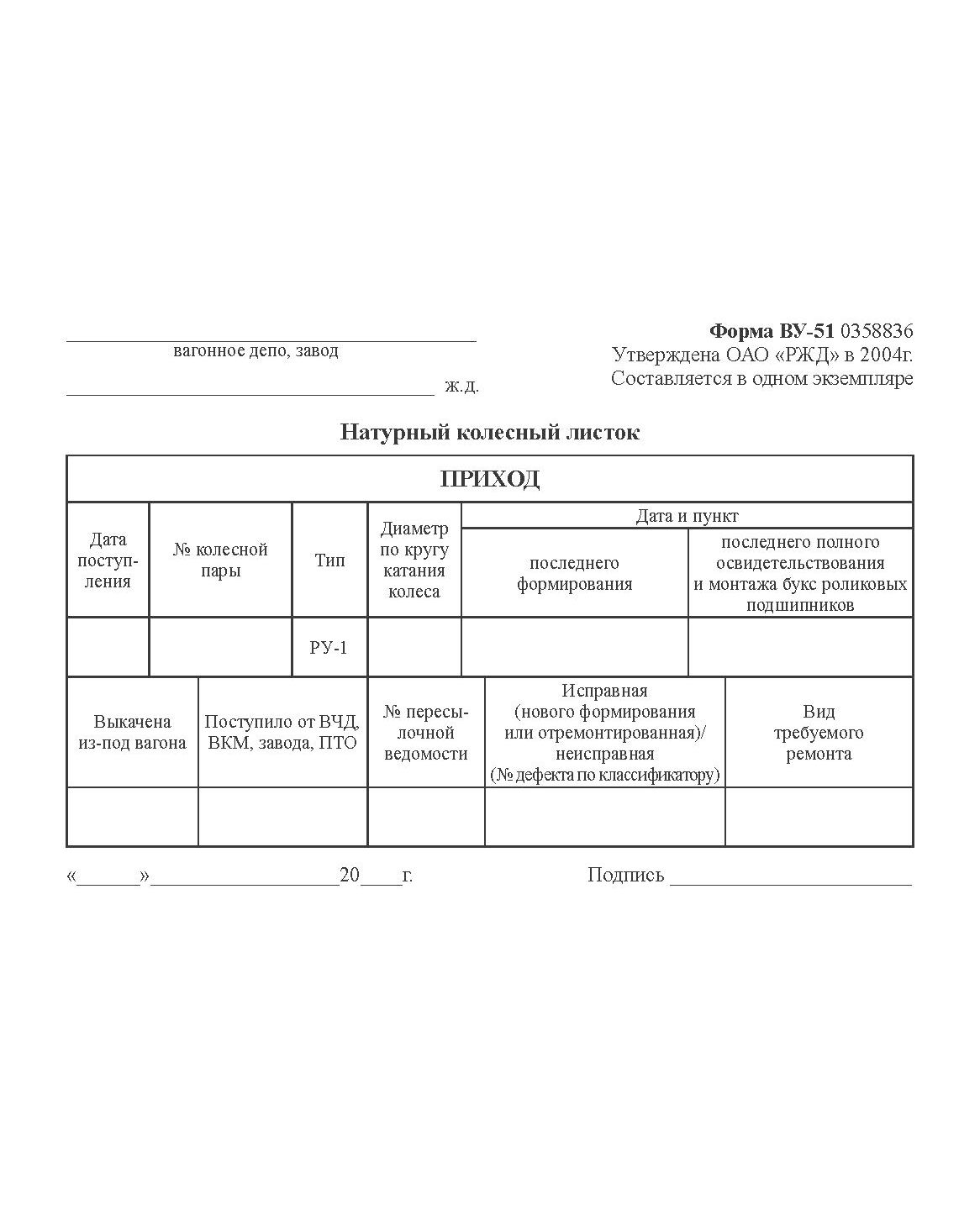 Натурный колесный листок формы ВУ-51 предназначен для учета поступления и расхода колесных пар в вагонном депо, на заводе, в дорожной вагоноколесной мастерской (ВКМ) и в других ремонтных пунктах (ПТО, МВРП и др.) и является первичным документом, на основании которого заполняются: журнал ремонта и оборота колесных пар формы ВУ-53,пересылочная ведомость на отправку колесных пар формы ВУ-50 и акт на исключение из инвентаря колесных пар формы ВУ-89.