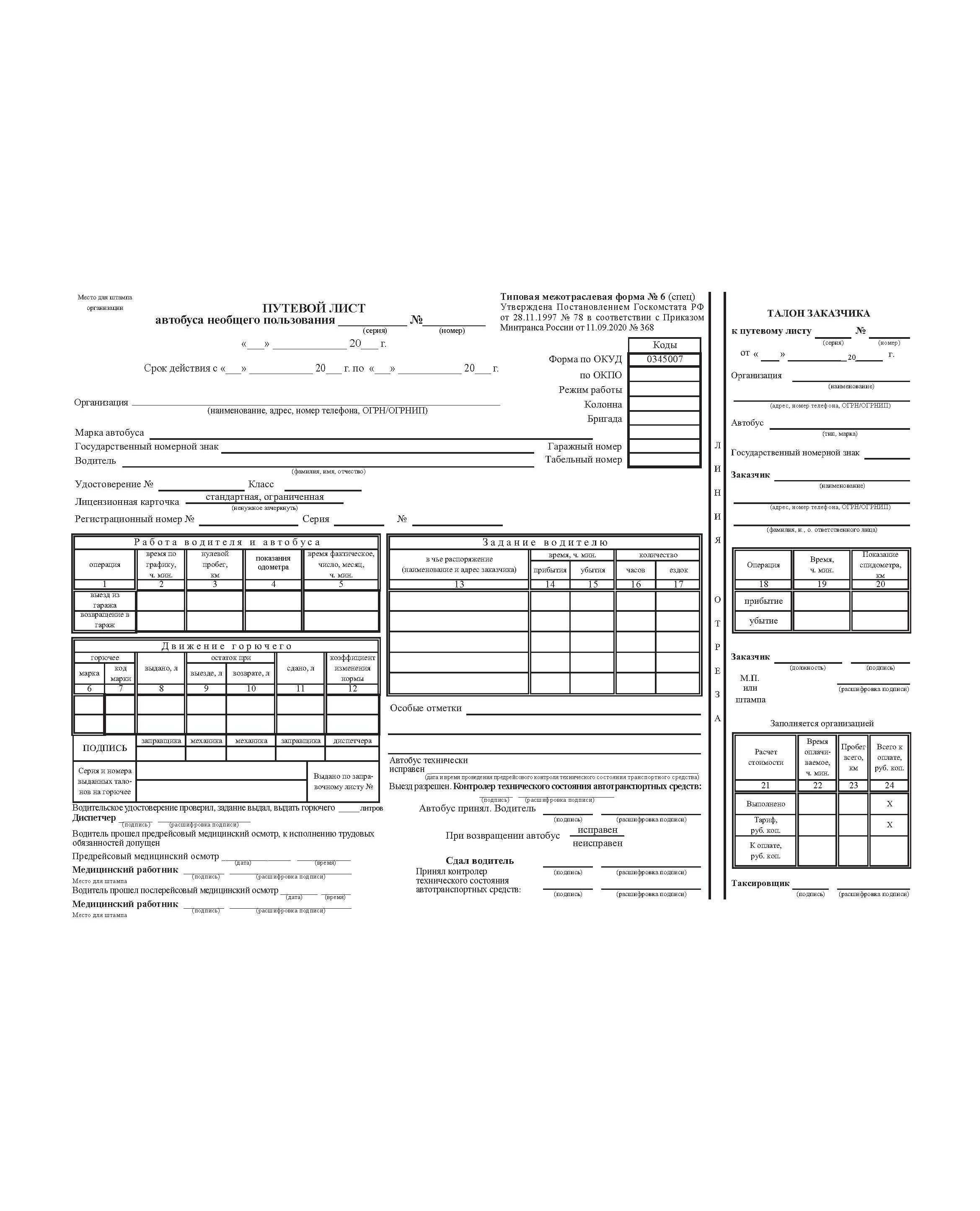 Форма, утв. Постановлением Госкомстата РФ от 28.11.1997 № 78 в соответствии с Приказом Минтранса России от 11.09.2020 № 368.