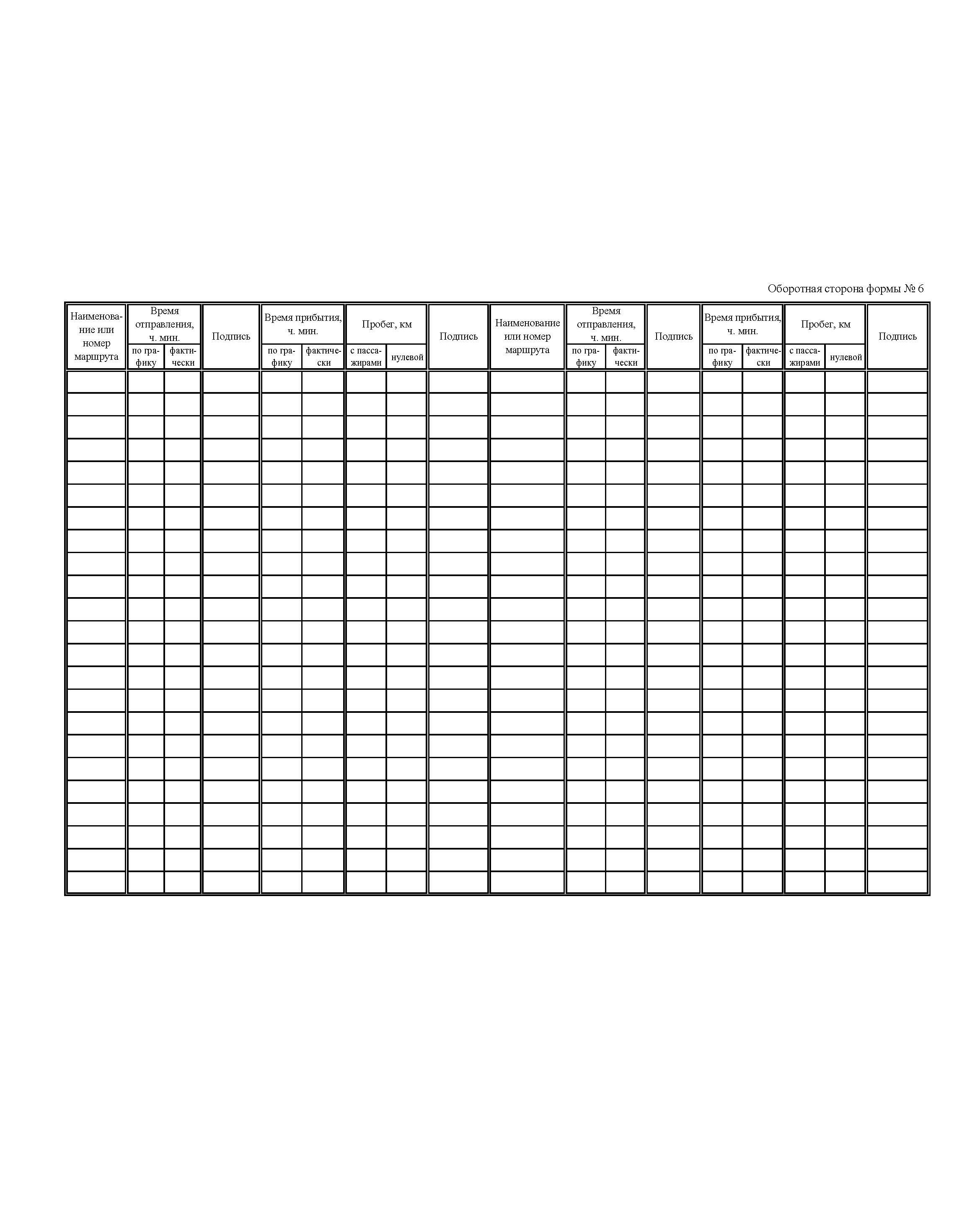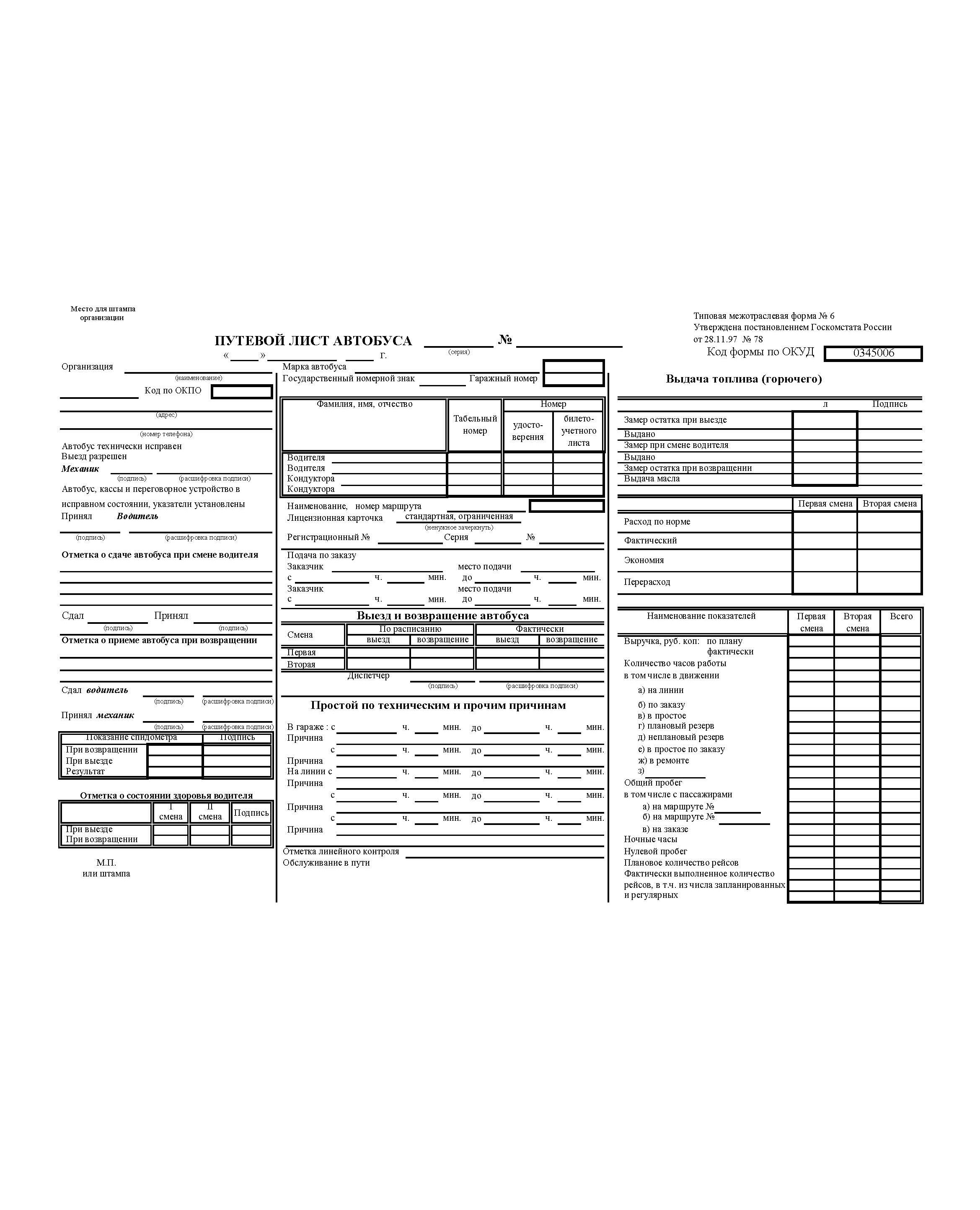 Путевой лист автобуса. Типовая межотраслевая форма № 6. Утверждена постановлением Госкомстата России от 28.11.97 № 78