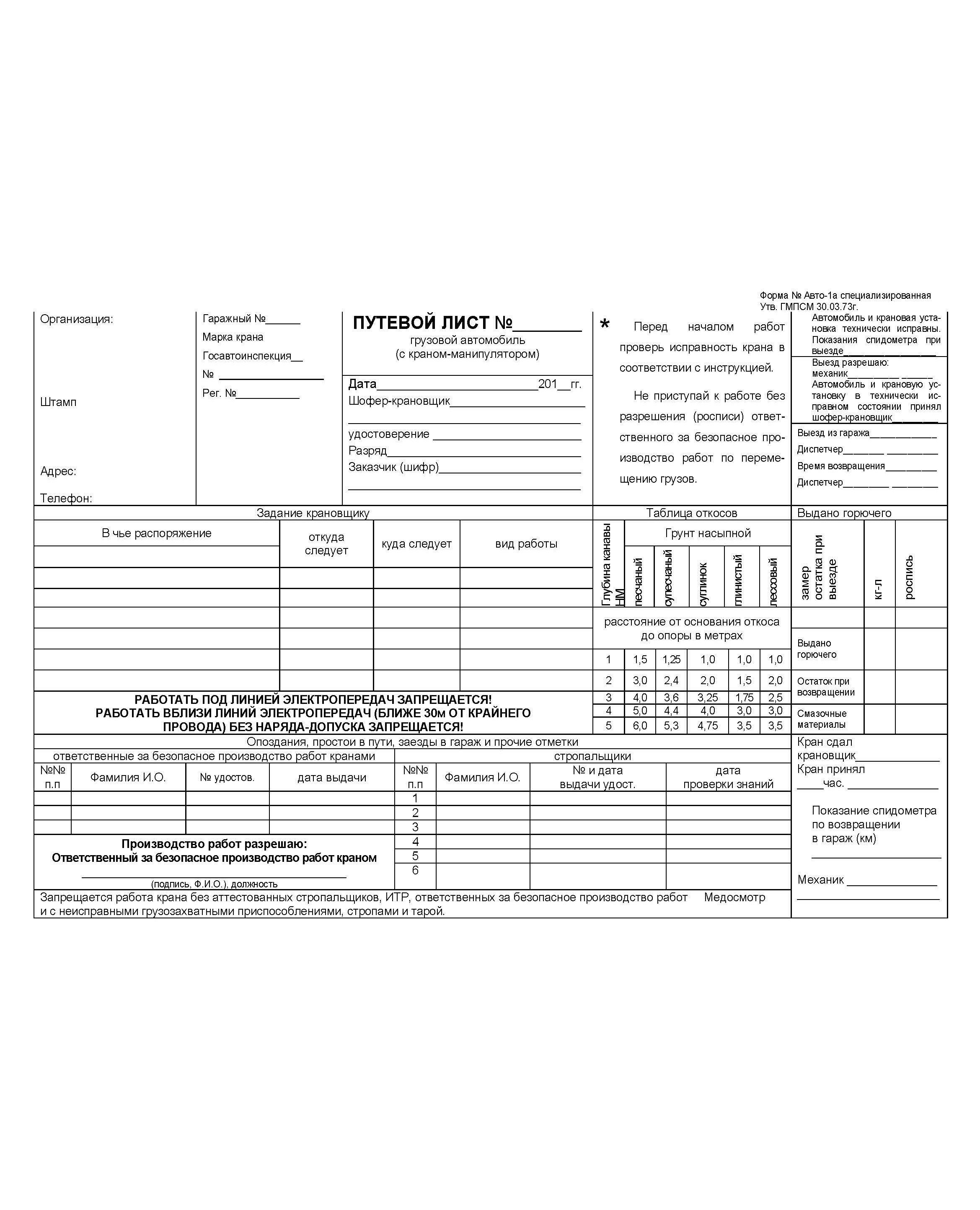 Путевой лист грузового автомобиля (с краном-манипулятором). Форма № Авто-1а специализированная. Утв. ГМПСМ 30.03.73г.