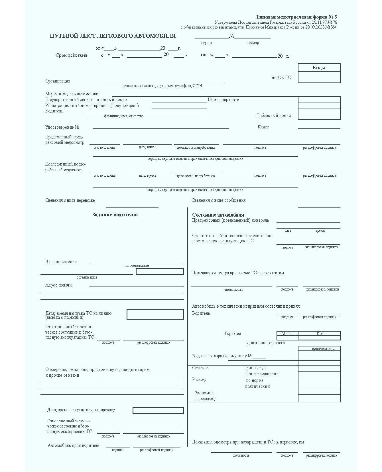 Путевой лист легкового автомобиля. Типовая форма № 3. Утверждена Постановлением Госкомстата России от 28.11.97 № 78 с обязательными реквизитами, утв. Приказом Минтранса России от 28.09.2022 № 390 (А5, 2-х сторонн)