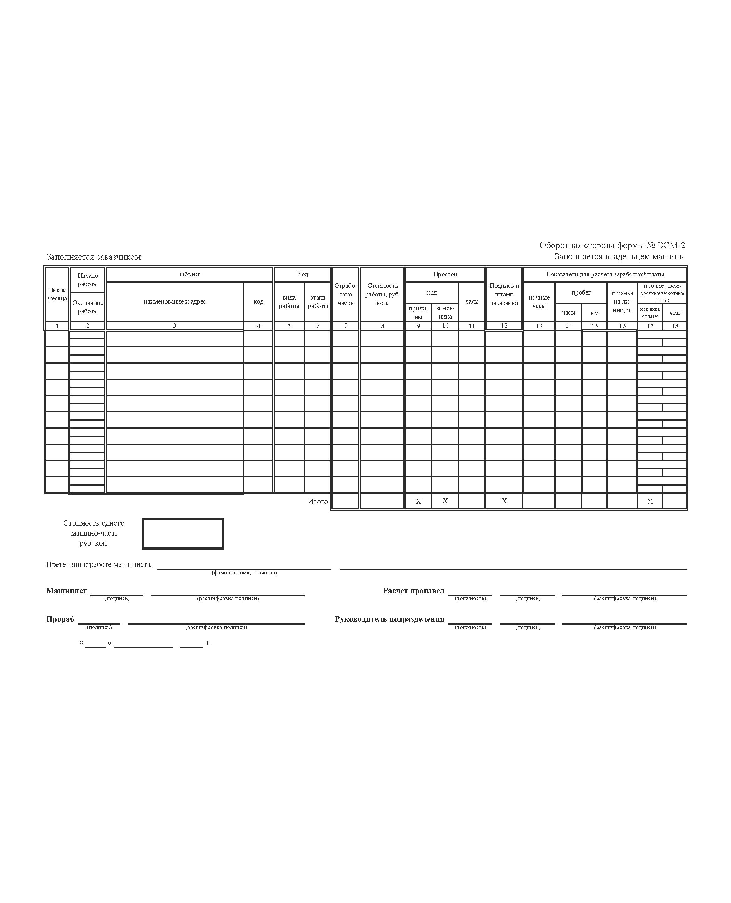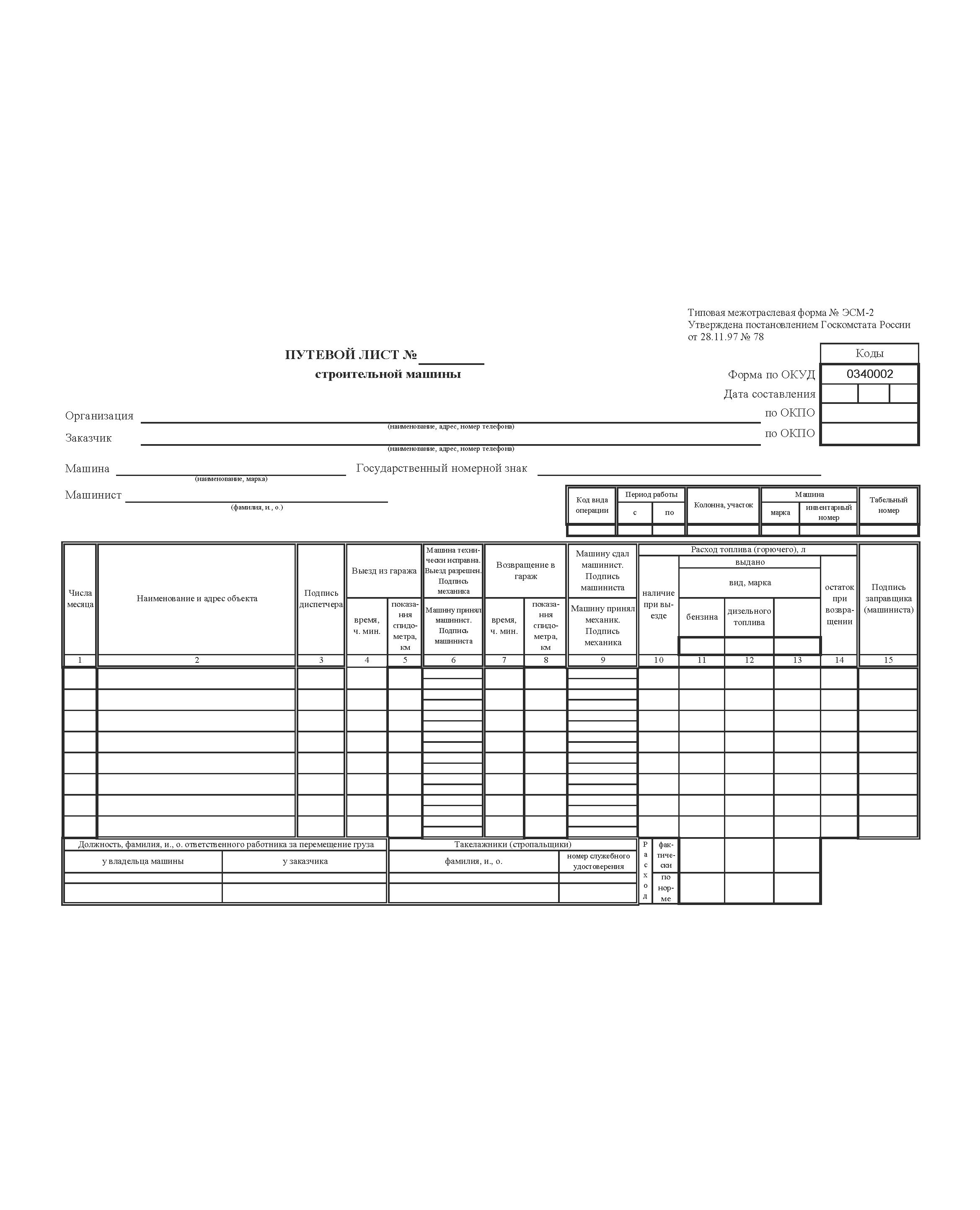 Путевой лист строительной машины, тип.форма ЭСМ-2 (формат А4)