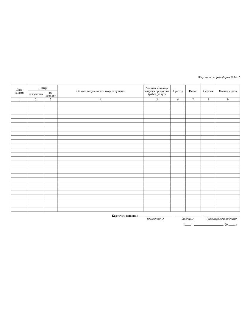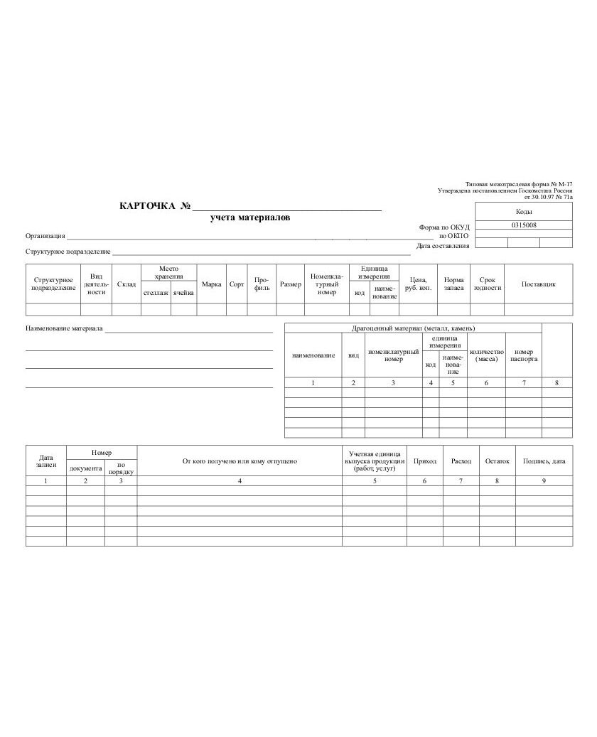 Карточка учета материалов. Типовая межотраслевая форма № М-17. Утверждена Постановлением Госкомстата России от 30.10.97 N 71а