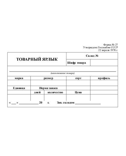 Товарный ярлык. Форма № 27. Утверждена Госснабом СССР 22.04.1970
