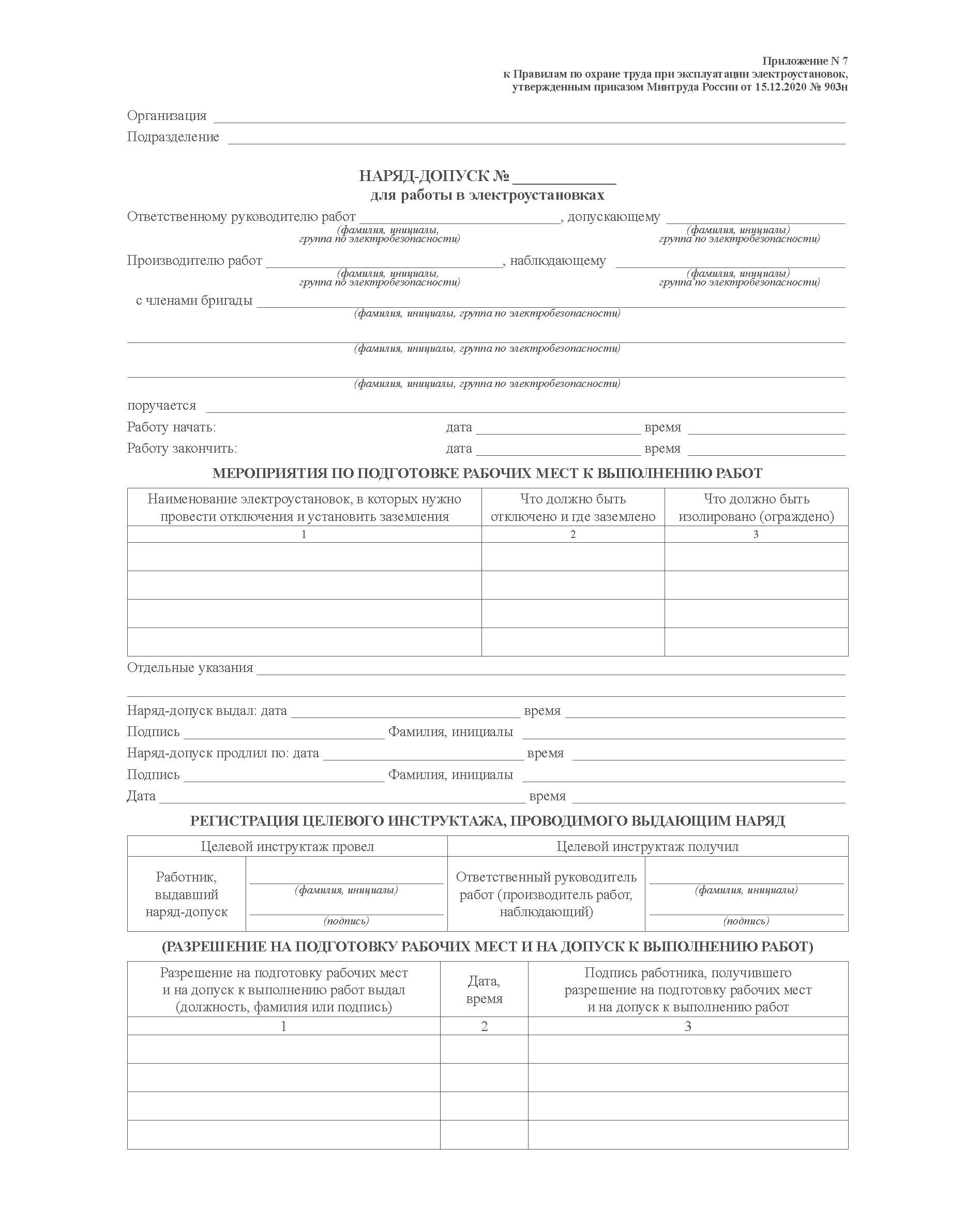 Наряд-допуск для работ в электроустановках (Приложение № 7 к Правилам по охране труда при эксплуатации электроустановок, утв. Приказом Минтруда РФ от 15.12.2020 № 903н (комплект из 40 бланков с методическими указаниями по заполнению, А4 -двухсторонний))