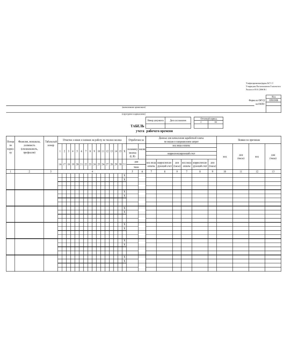 Т-13 Табель учета рабочего времени. Унифицированная форма № Т-13. Утверждена Постановлением Госкомстата России от 05.01.2004 № 1 (А3, 2-стор.)