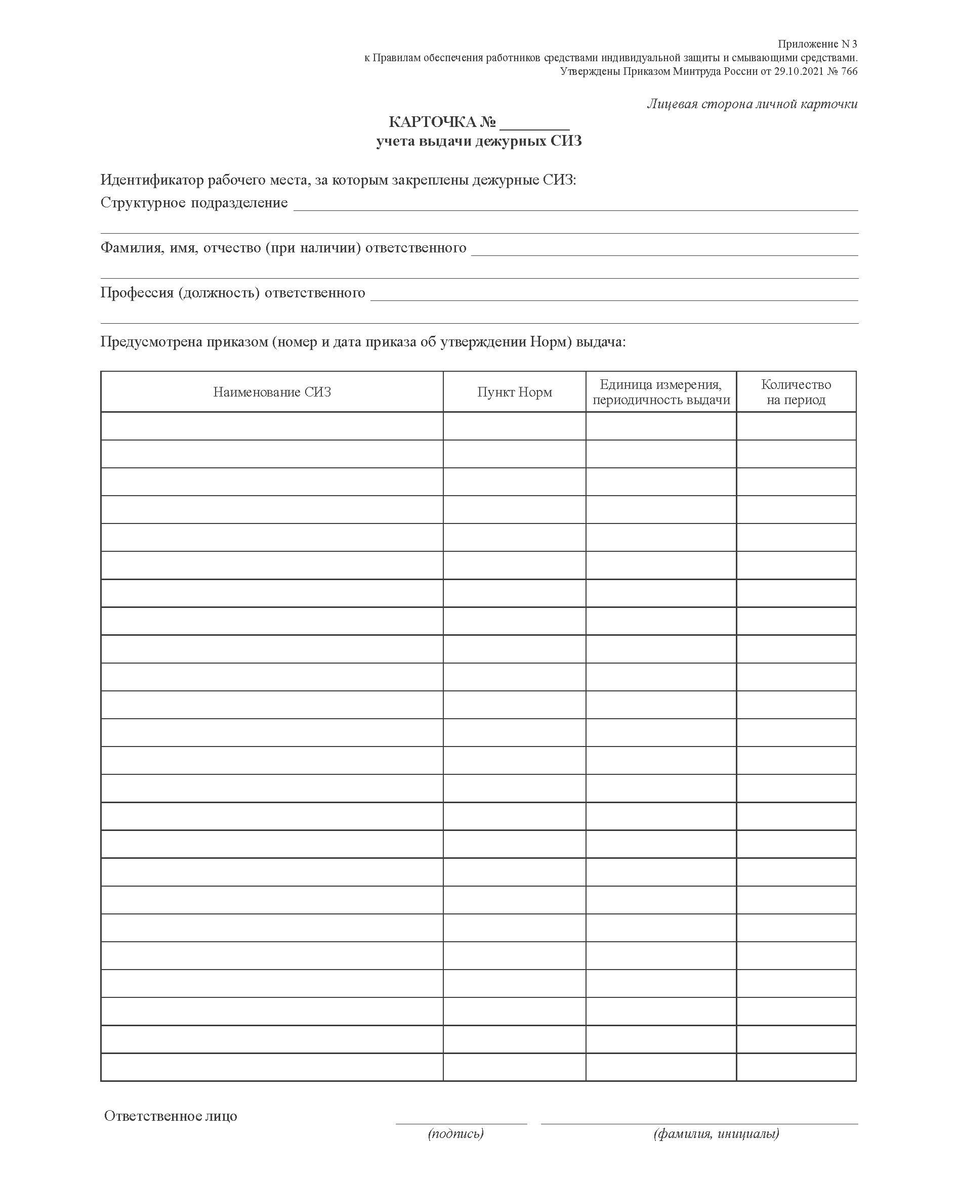 Карточка учета выдачи дежурных СИЗ (формат А4) Приложение 3 к Приказу Минтруда России от 29.10.2021 № 766н