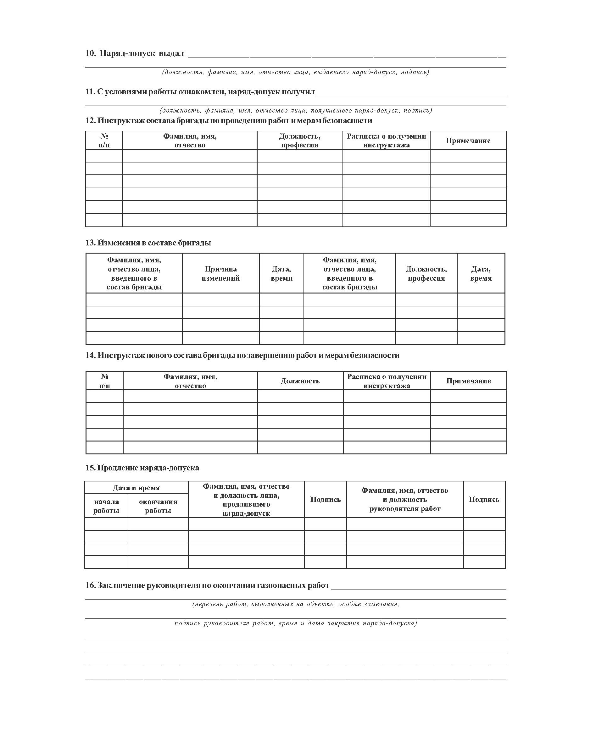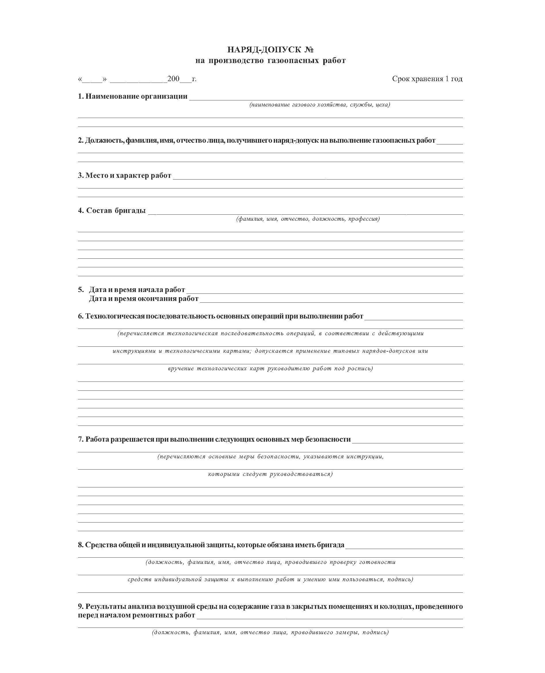 Наряд-допуск на производство газоопасных работ. (Приложение 1 к Приказу Ростехнадзора от 15.12.2020 N 531) (блок из 40 бланков, А4 (двухсторонний).