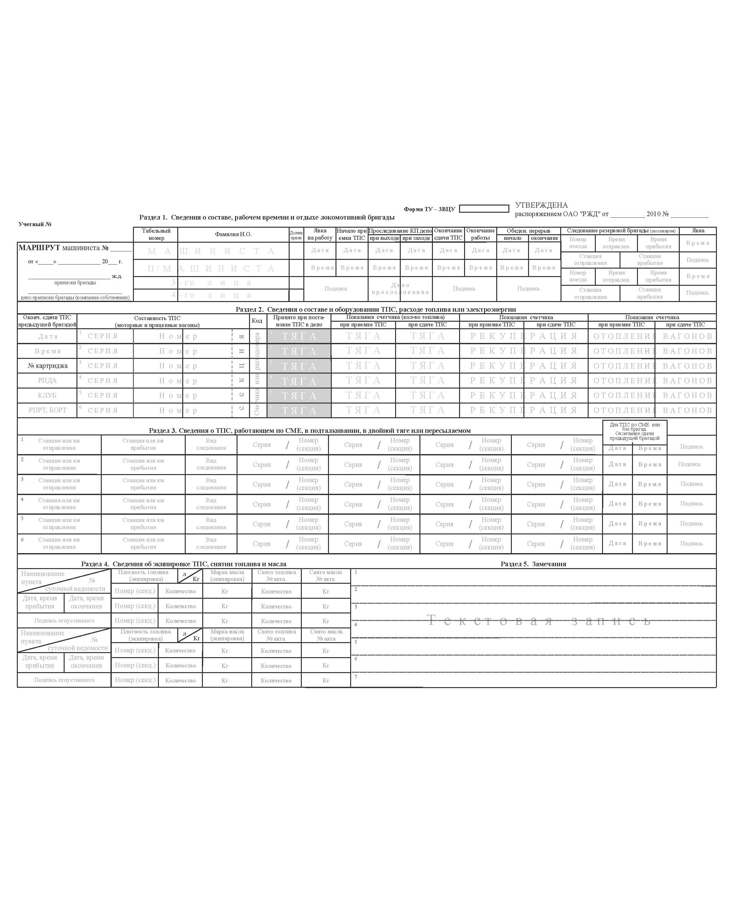 Бланк "Маршрут машиниста" (форма ТУ-ЗВЦУ). Утверждена Распоряжением ОАО "РЖД" от 27.05.2010 № 1117р в редакции Распоряжения ОАО "РЖД" от 04.10.2023 № 2506/р