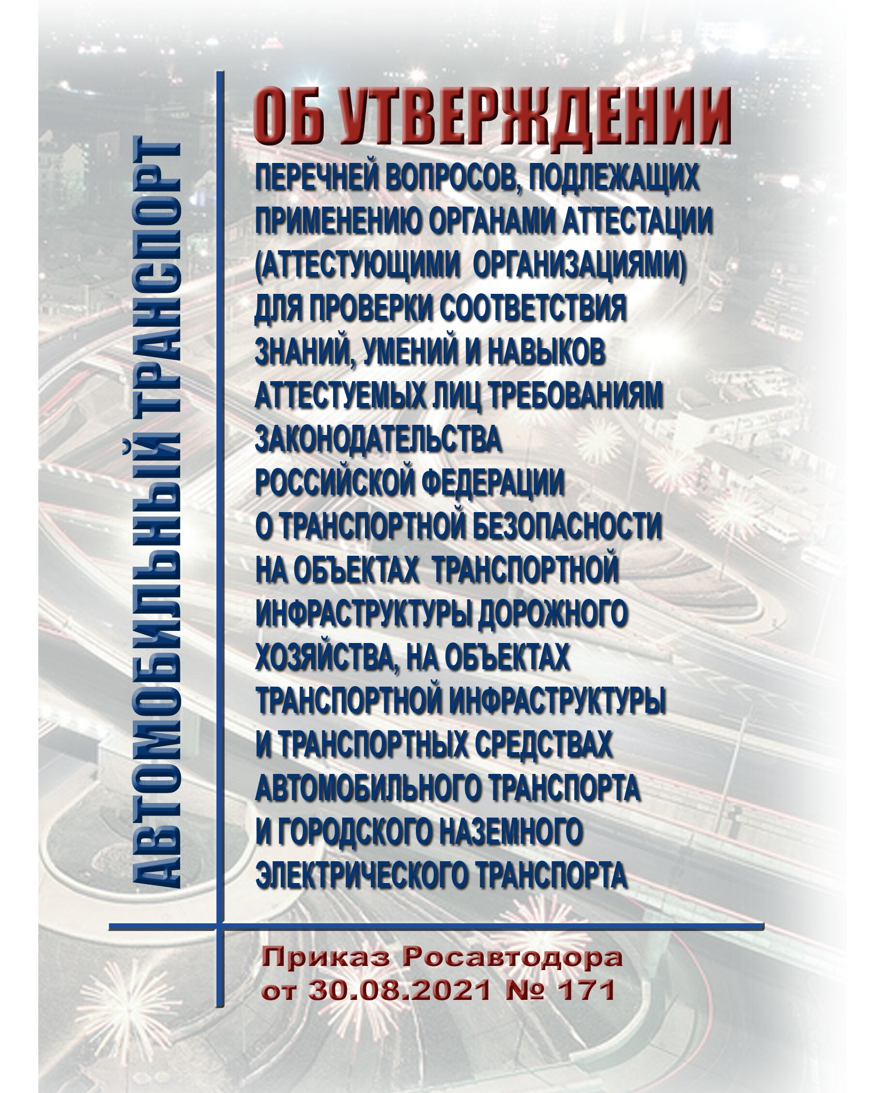 Приказом Росавтодора от 30.08.2021 № 171 утверждены 9 перечней вопросов, подлежащих применению органами аттестации (аттестующими организациями) для проверки соответствия знаний, умений и навыков, являющихся обязательными для работников различных специальностей на объектах транспортной инфраструктуры дорожного хозяйства, на объектах транспортной инфраструктуры и транспортных средствах автомобильного транспорта и городского наземного электрического транспорта.