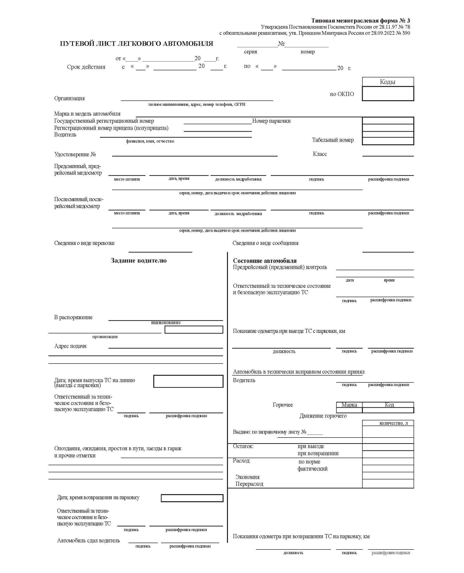 Главная/Книжные издания (Книги, брошюры)/Автомобильный транспорт/Путевой лист легкового автомобиля. Типовая форма № 3. Утверждена Постановлением Госкомстата России от 28.11.97 № 78 с обязательными реквизитами, утв. Приказом Минтранса России от 28.09.2022 № 390 (А4, книжный, 1+1), бумага 80 гр.