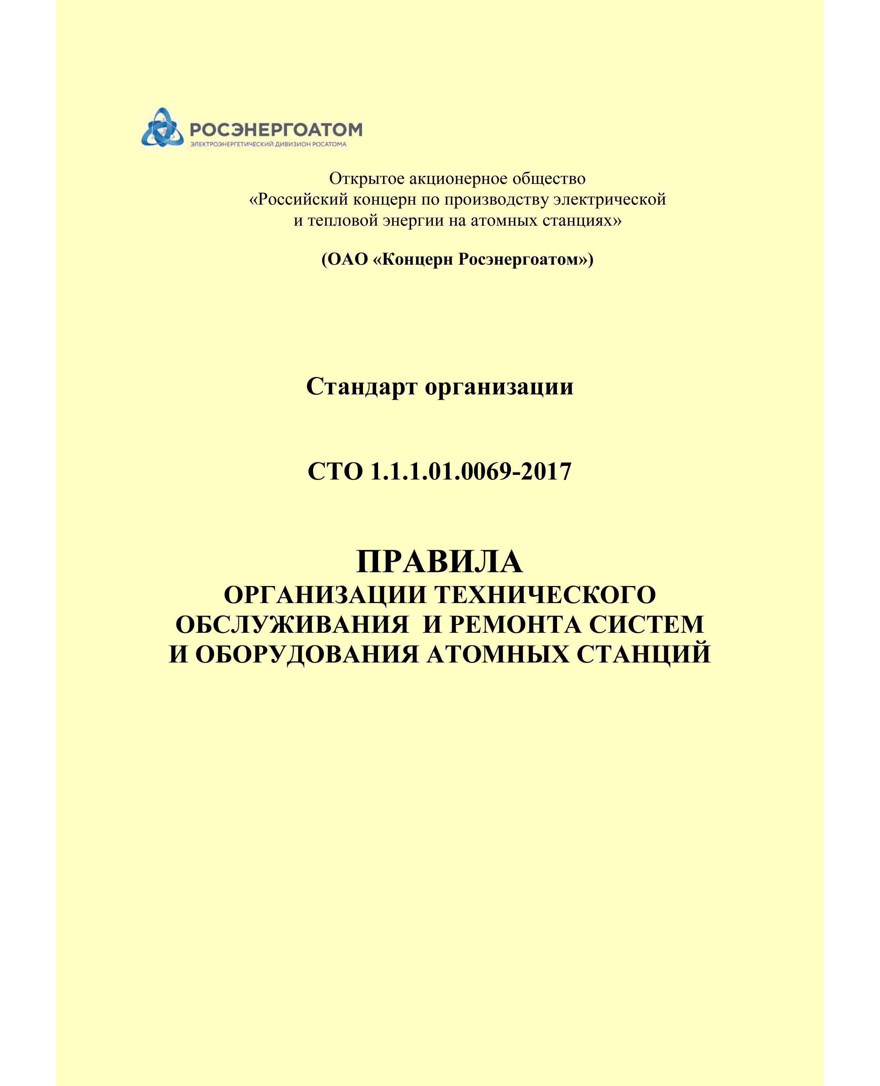 СТО 1.1.1.01.0069-2017 устанавливает основные правила организации технического обслуживания и ремонта систем и оборудования атомных станций, требования по планированию и подготовке работ по техническому обслуживанию и ремонту, к обеспечению качества работ, оценке и анулизу эфективности Системы технического обслуживания и ремонта атомных станций.