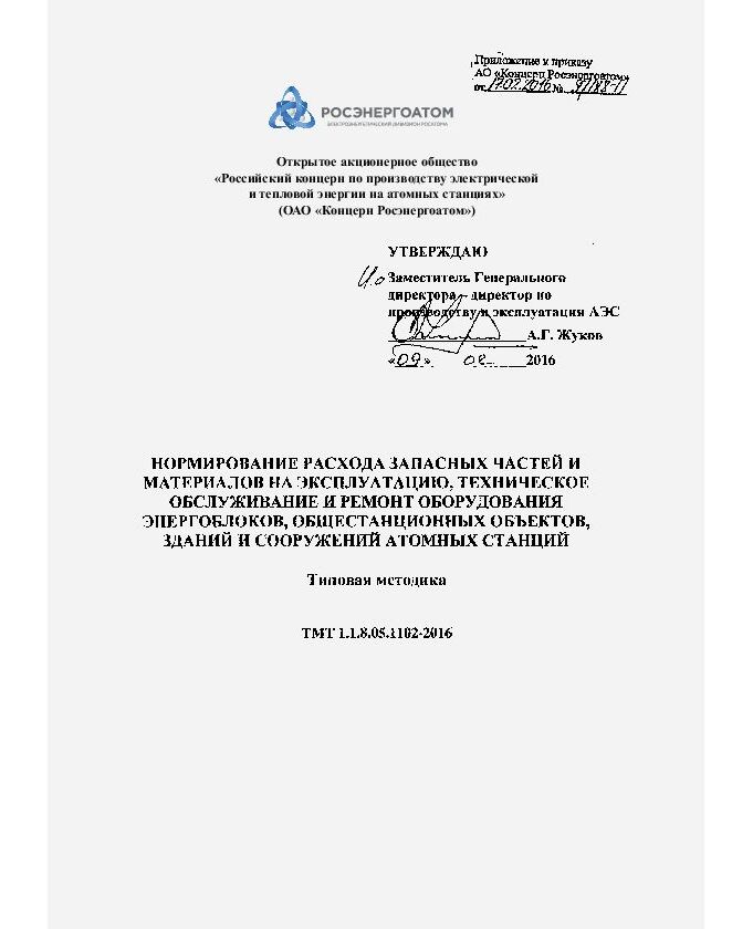 ТМТ 1.1.8.05.1102-2016. Типовая методика. Нормирование расхода запасных частей и материалов на эксплуатацию, техническое обслуживание и ремонт оборудования энергоблоков, общестанционных объектов, зданий и сооружений атомных станций. Приложение к приказу АО «Концерн Росэнергоатом» от 17.02.2016 № 9/188-П