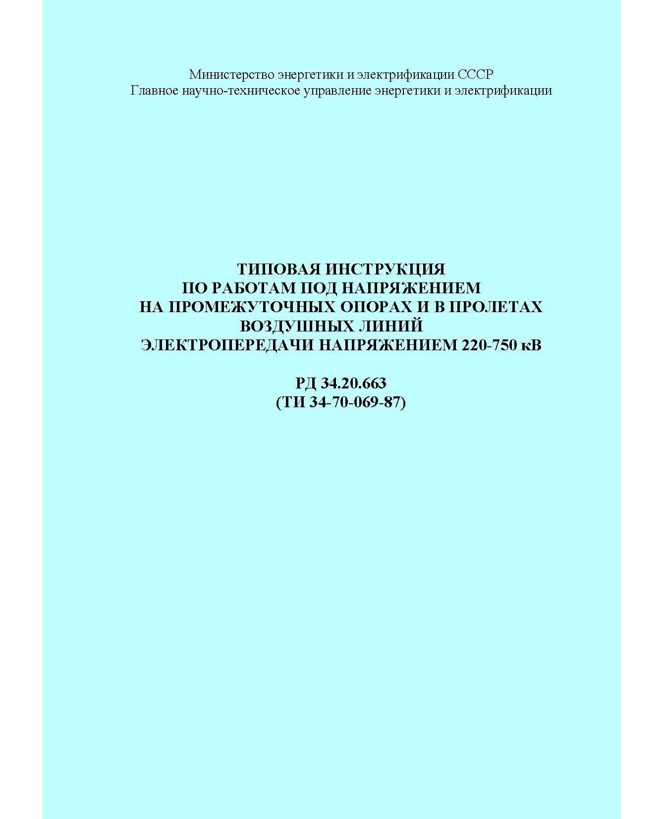 РД 34.20.663 (ТИ 34-70-069-87; СО 153-34.20.663). Типовая инструкция по работам под напряжением на промежуточных опорах и в пролетах воздушных линий электропередачи напряжением 220-750 кВ. Утвержден и введен в действие Минэнерго СССР 27.05.1987 г. с Изм.№ 1, утв. Минэнерго СССР 02.06.88 г.