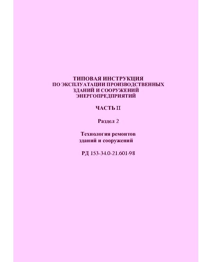 РД 153-34.0-21.601-98 (СО 34.21.601-98) Типовая инструкция по эксплуатации производственных зданий и сооружений энергопредприятий. Часть II. Раздел 2. Технология ремонтов зданий и сооружений. Утвержден и введен в действие РАО "ЕЭС России" 22.12.1998 г.