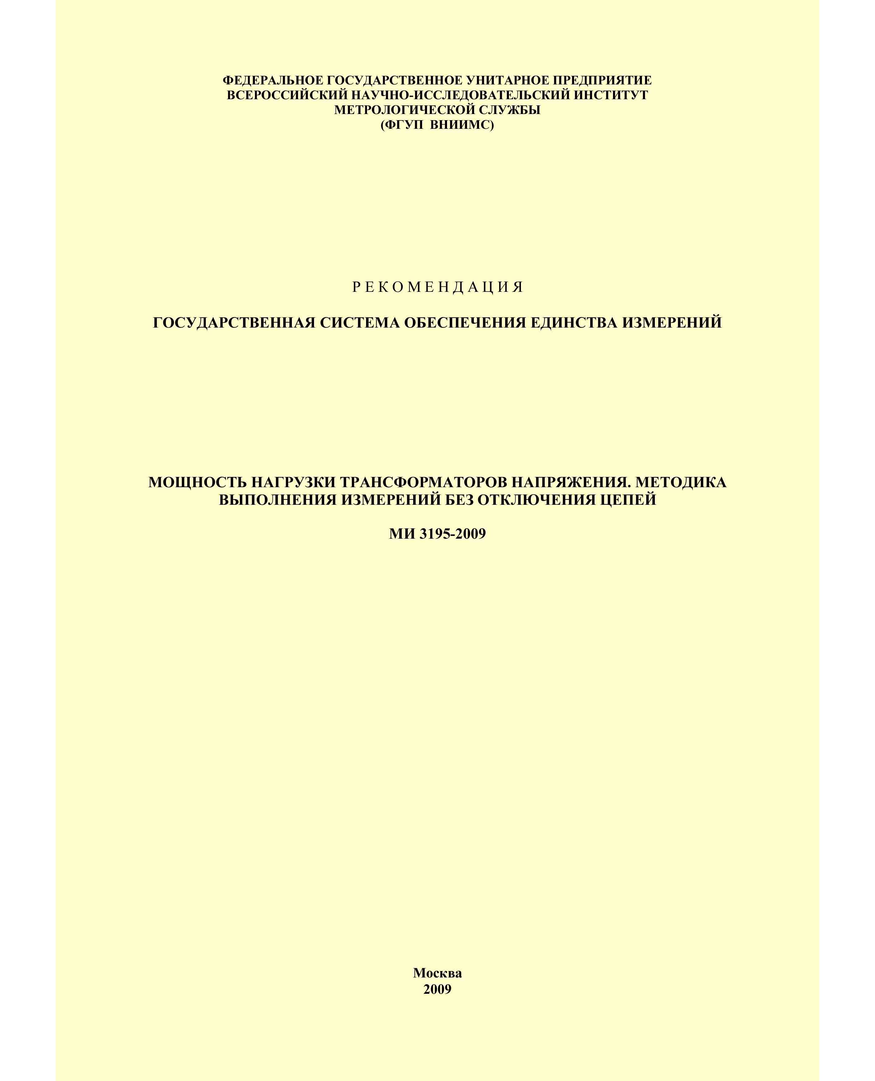 МИ 3195-2009 ГСИ. Мощность нагрузки трансформаторов напряжения, методика выполнения измерений без отключения цепей. Утверждена ФГУП «ВНИИМС» 19.02.2009 г.