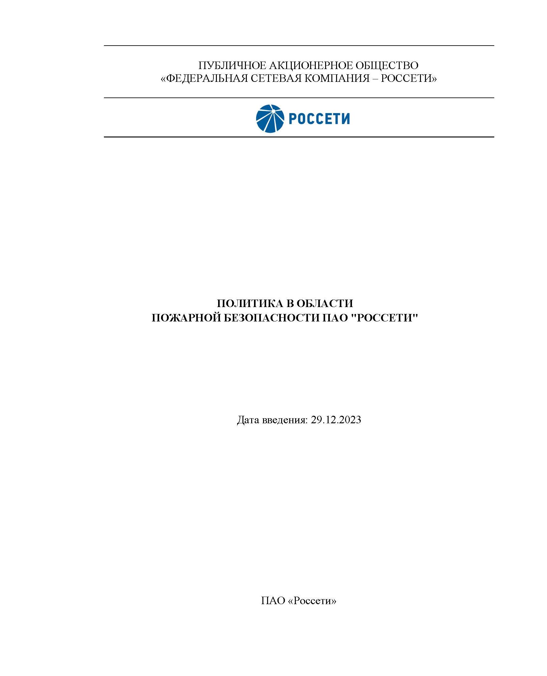 Настоящая Политика в области пожарной безопасности Публичного акционерного общества «Федеральная сетевая компания - Россети» (ПАО «Россети»).
