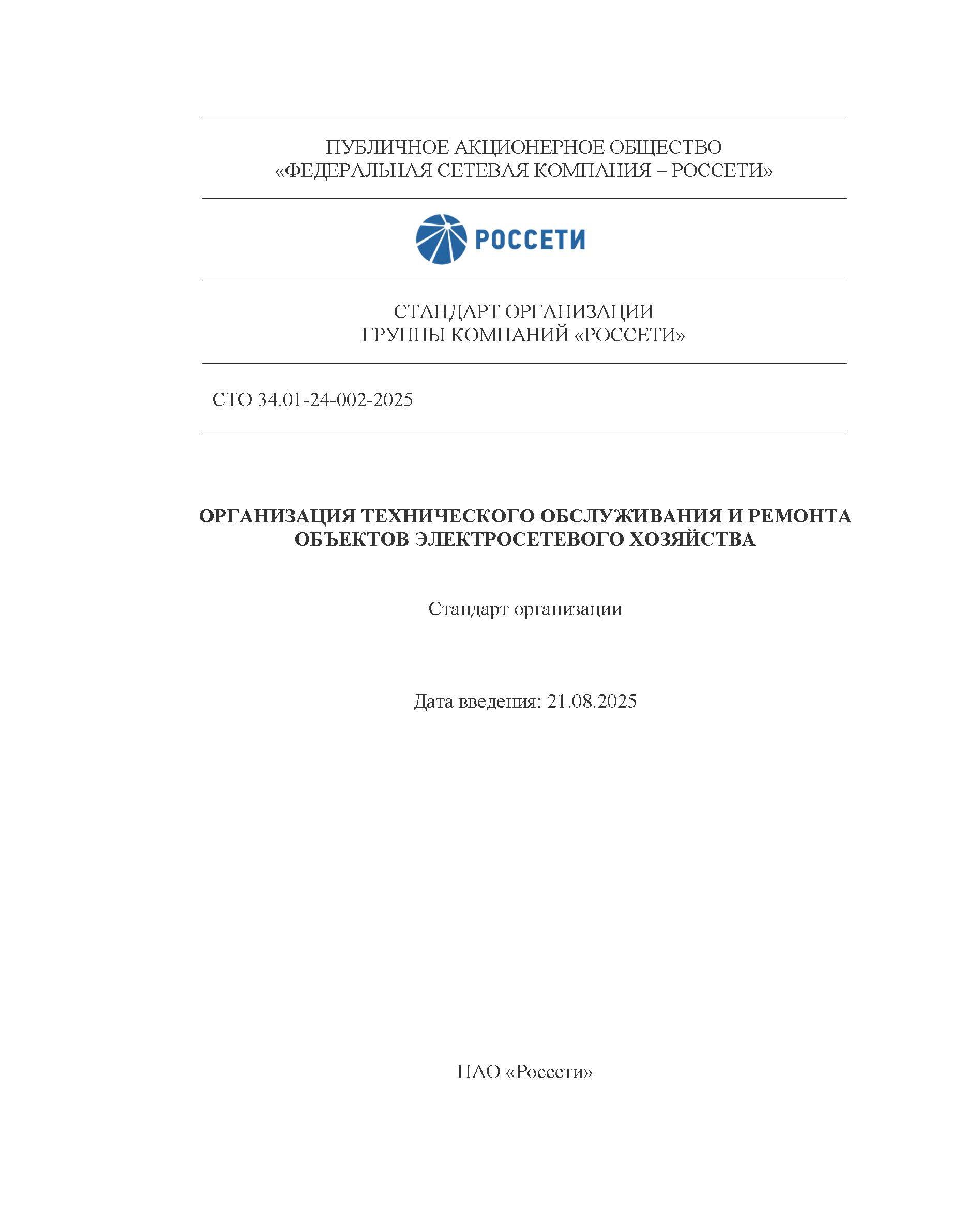 Взамен СТО 34.01-24-002-2021 «Организация технического обслуживания и ремонта объектов электросетевого хозяйства», утв. Распоряжением ПАО «Россети» от 29.07.2021 № 268р.
