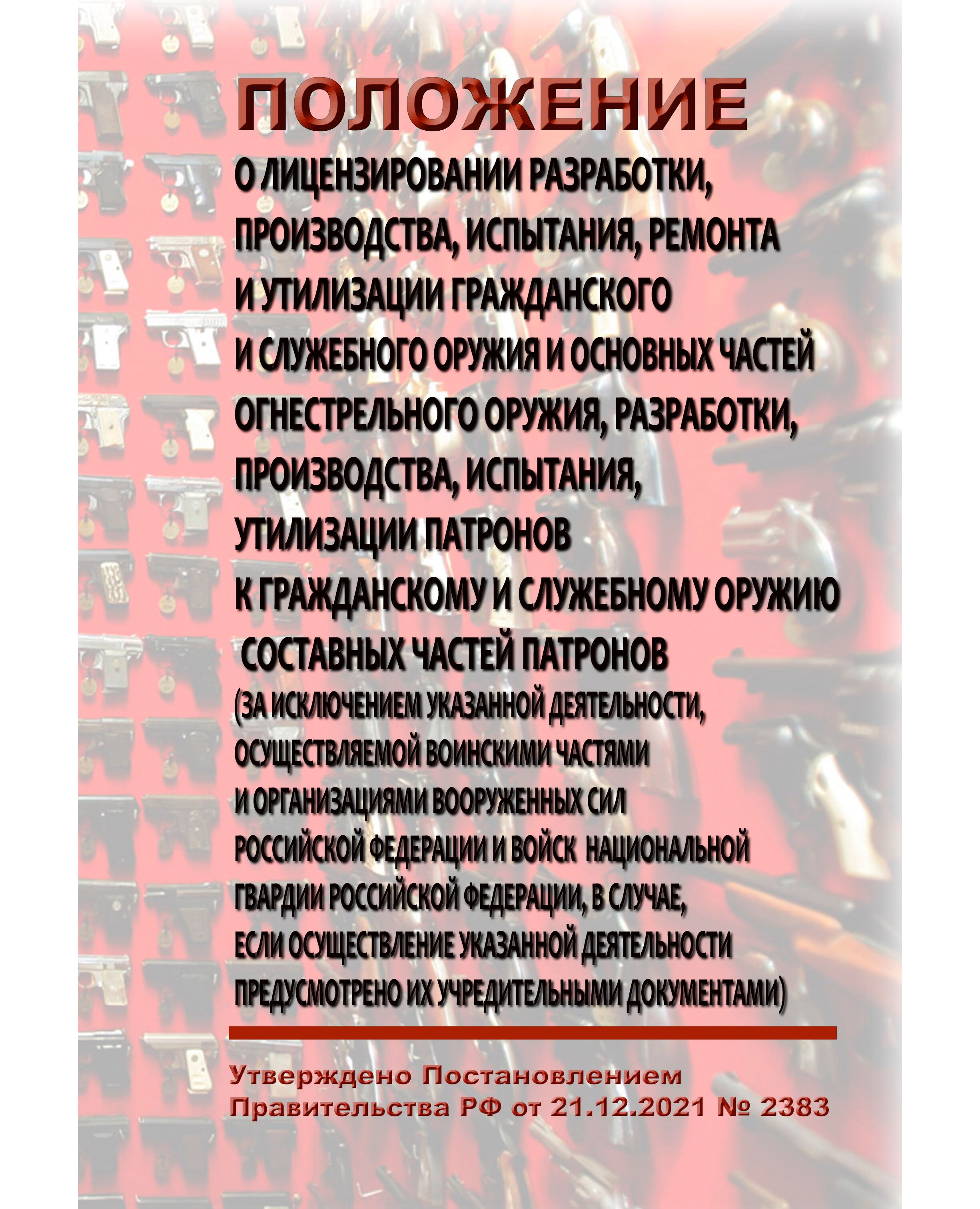 Положение устанавливает порядок лицензирования разработки, производства, испытания, ремонта и утилизации гражданского и служебного оружия и основных частей огнестрельного оружия, разработки, производства, испытания, утилизации патронов к гражданскому и служебному оружию и составных частей патронов (за исключением указанной деятельности, осуществляемой воинскими частями и организациями Вооруженных Сил Российской Федерации и войск национальной гвардии Российской Федерации, в случае, если осуществление указанной деятельности предусмотрено их учредительными документами), осуществляемых юридическими лицами на территории Российской Федерации.