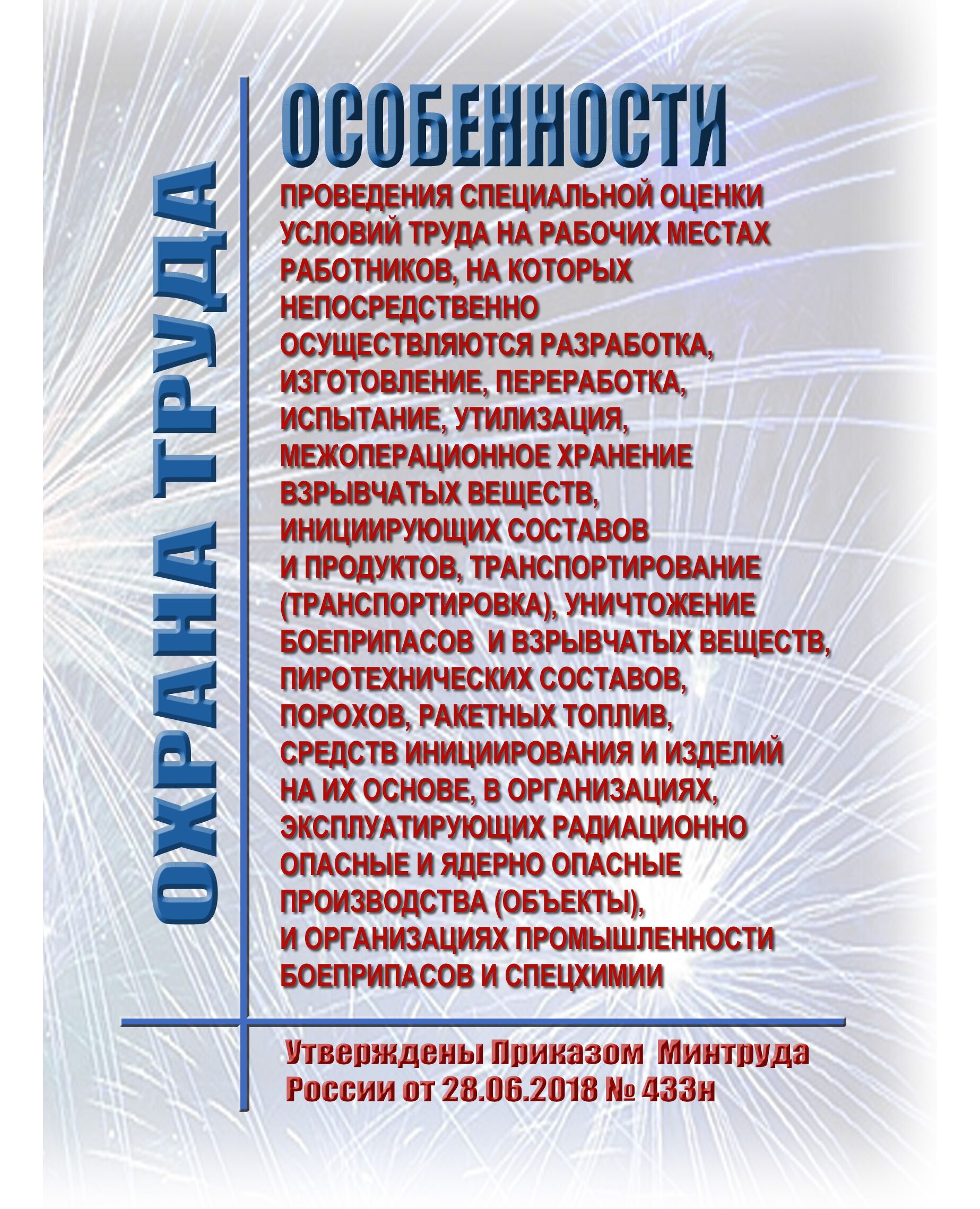 Настоящие Особенности распространяются на рабочие места в организациях, допущенных в установленном законодательством Российской Федерации порядке к осуществлению (проведению) деятельности (работ) по разработке, изготовлению, переработке, испытанию, утилизации, межоперационному хранению взрывчатых веществ, инициирующих составов и продуктов, транспортированию (транспортировке), уничтожению боеприпасов и взрывчатых веществ, пиротехнических составов, порохов, ракетных топлив, средств инициирования и изделий на их основе, за исключением рабочих мест работников радиационно опасных и ядерно опасных производств (объектов), занятых на работах с техногенными источниками ионизирующих излучений.