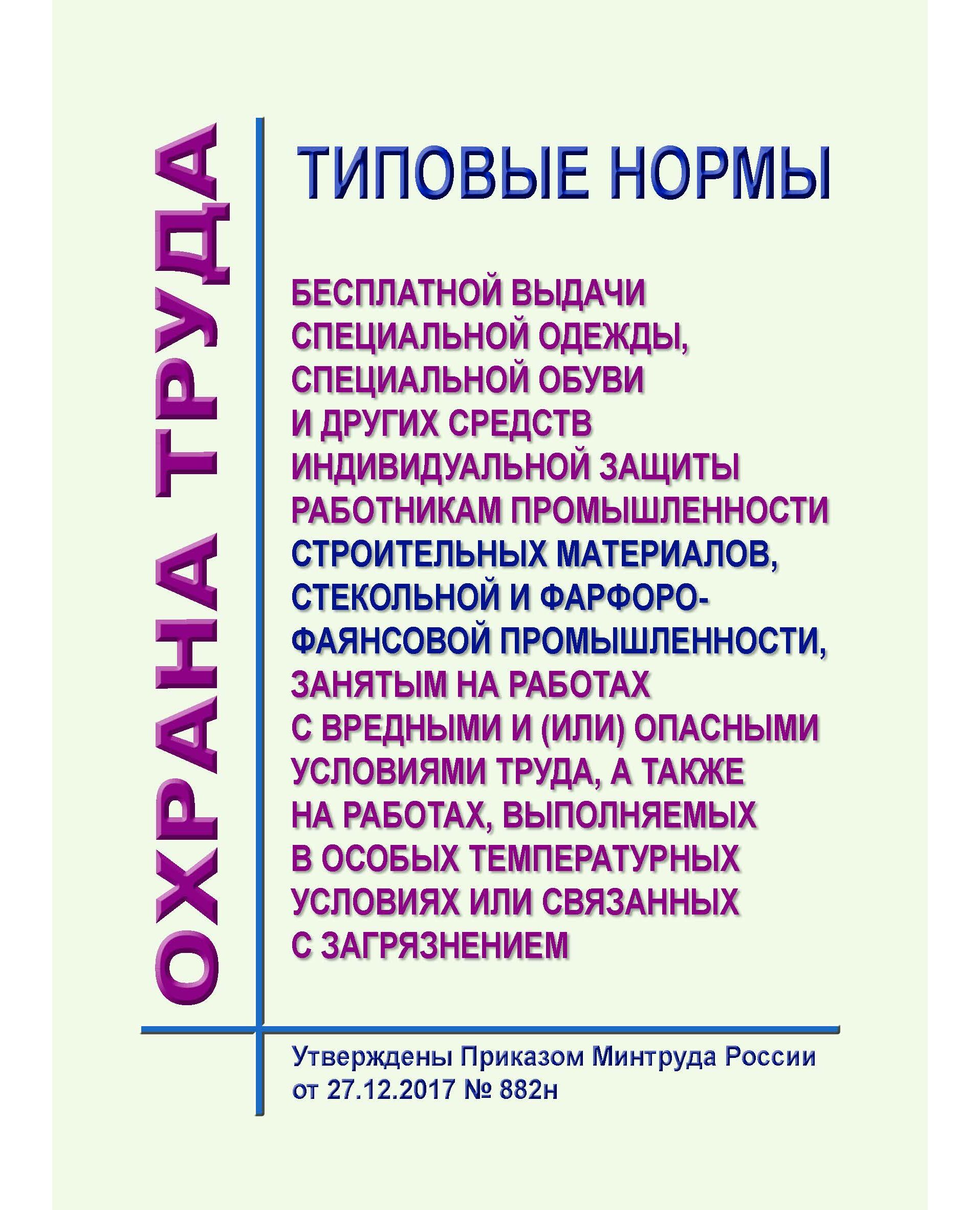 Главная/Книжные издания (Книги, брошюры)/Охрана труда и безопасность работ/Нормативные документы межотраслевого применения/Типовые нормы бесплатной выдачи специальной одежды, специальной обуви и других средств индивидуальной защиты работникам промышленности строительных материалов, стекольной и фарфоро-фаянсовой промышленности, занятым на работах с вредными и (или) опасными условиями труда, а также на работах, выполняемых в особых температурных условиях или связанных с загрязнением". Утверждены Приказ Минтруда России от 27.12.2017 № 882н