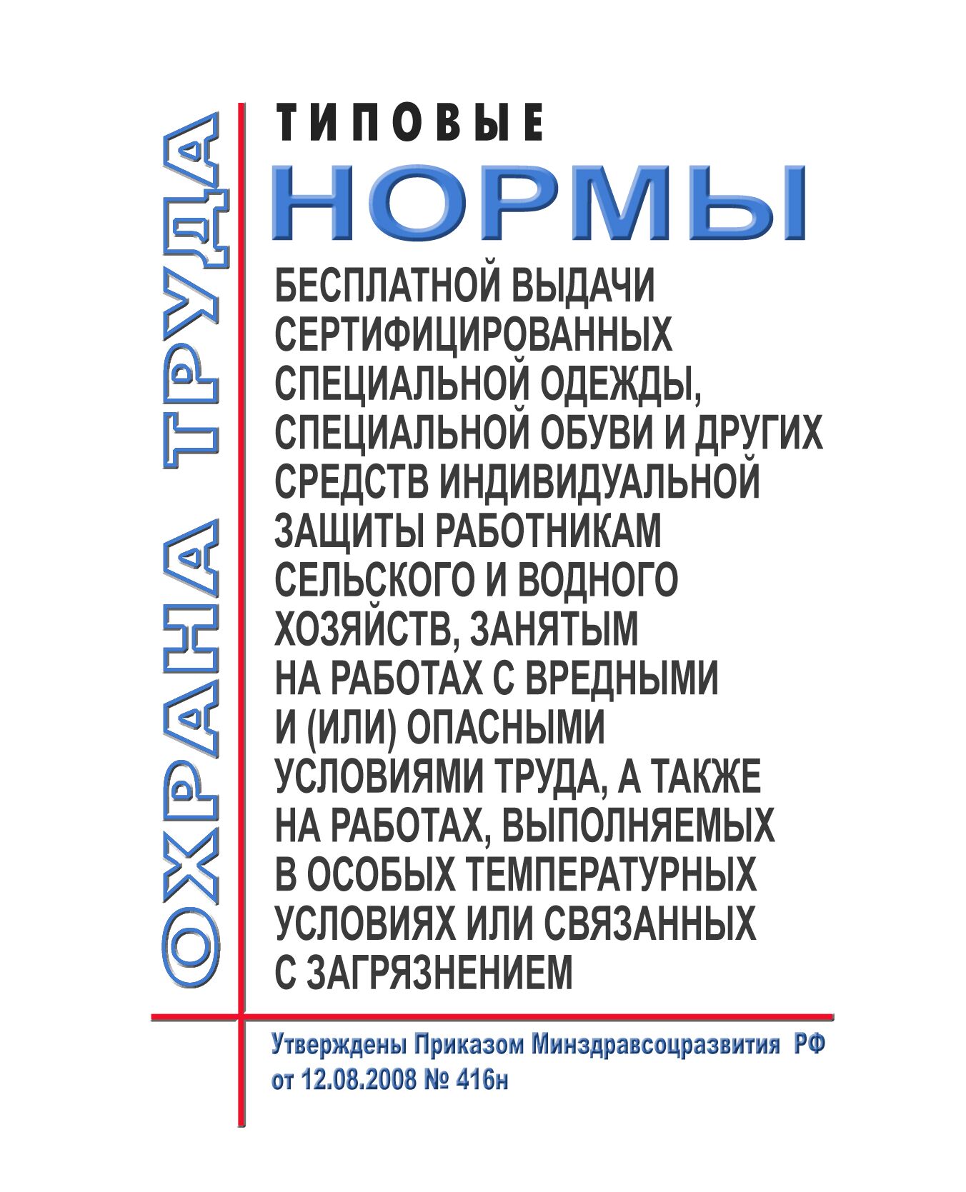 Главная/Книжные издания (Книги, брошюры)/Охрана труда и безопасность работ/Охрана труда в отдельных отраслях экономики/Агропромышленный комплекс/Типовые нормы бесплатной выдачи сертифицированных специальной одежды, специальной обуви и других средств индивидуальной защиты работникам сельского и водного хозяйств, занятым на работах с вредными и (или) опасными условиями труда, а также на работах, выполняемых в особых температурных условиях или связанных с загрязнением. Утверждены Приказом Минздравсоцразвития РФ от 12.08.2008 № 416н в редакции Приказа Минтруда РФ от 20.02.2014 № 103н