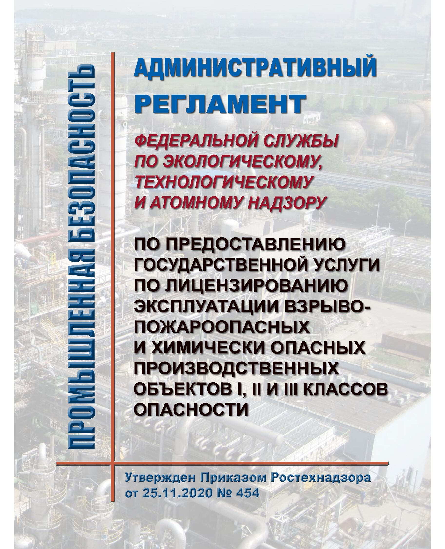 Административный регламент Федеральной службы по экологическому, технологическому и атомному надзору по предоставлению государственной услуги по лицензированию эксплуатации взрывопожароопасных и химически опасных производственных объектов I, II и III классов опасности. Утвержден Приказом Приказ Ростехнадзора от 25.11.2020 № 454 в редакции Приказа Ростехнадзора от 24.11.2021 № 403