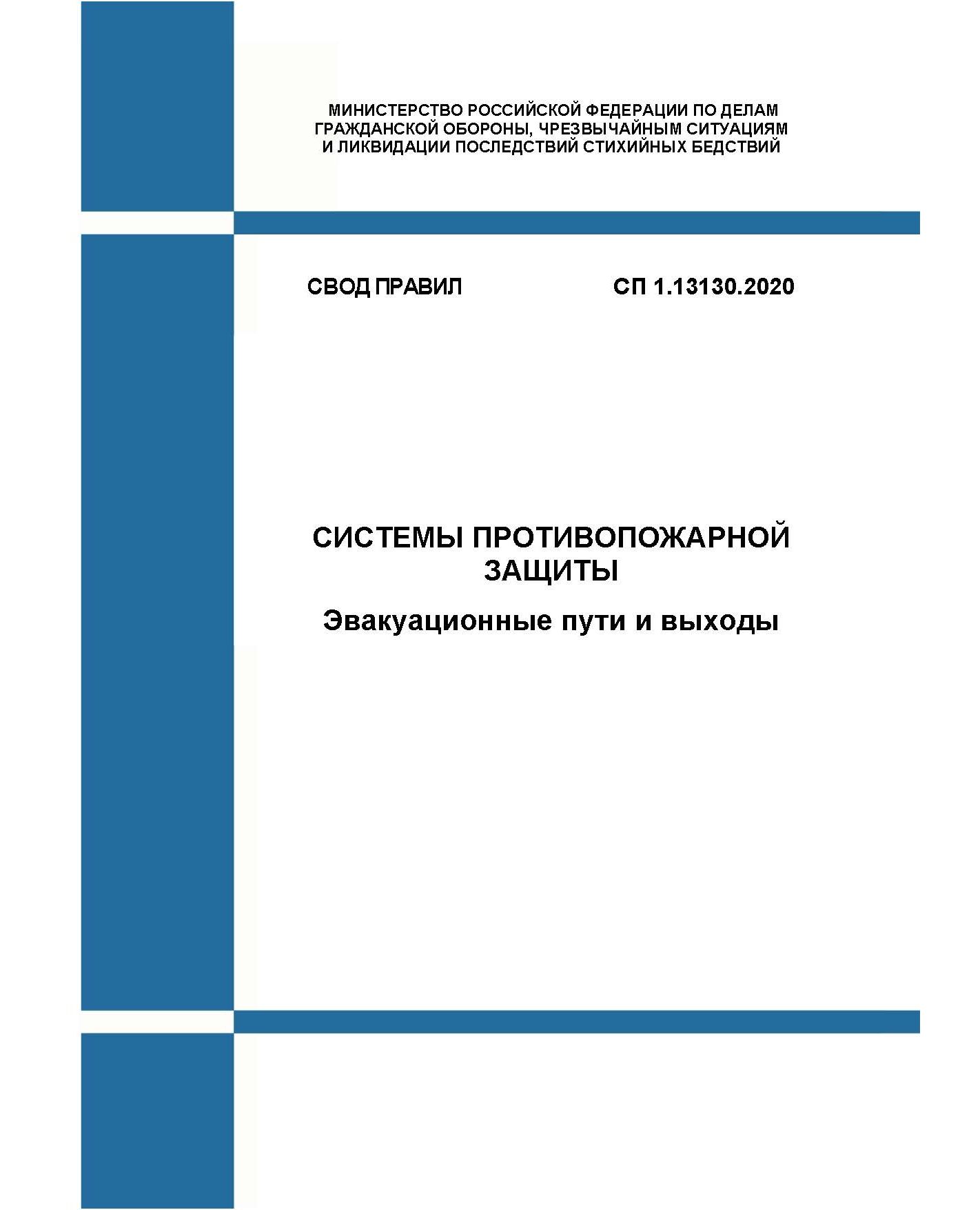 СП 1.13130.2020 устанавливает требования пожарной безопасности к эвакуационным путям, эвакуационным и аварийным выходам из помещений, зданий и сооружений, а также требования пожарной безопасности к эвакуационным путям для наружных технологических установок.