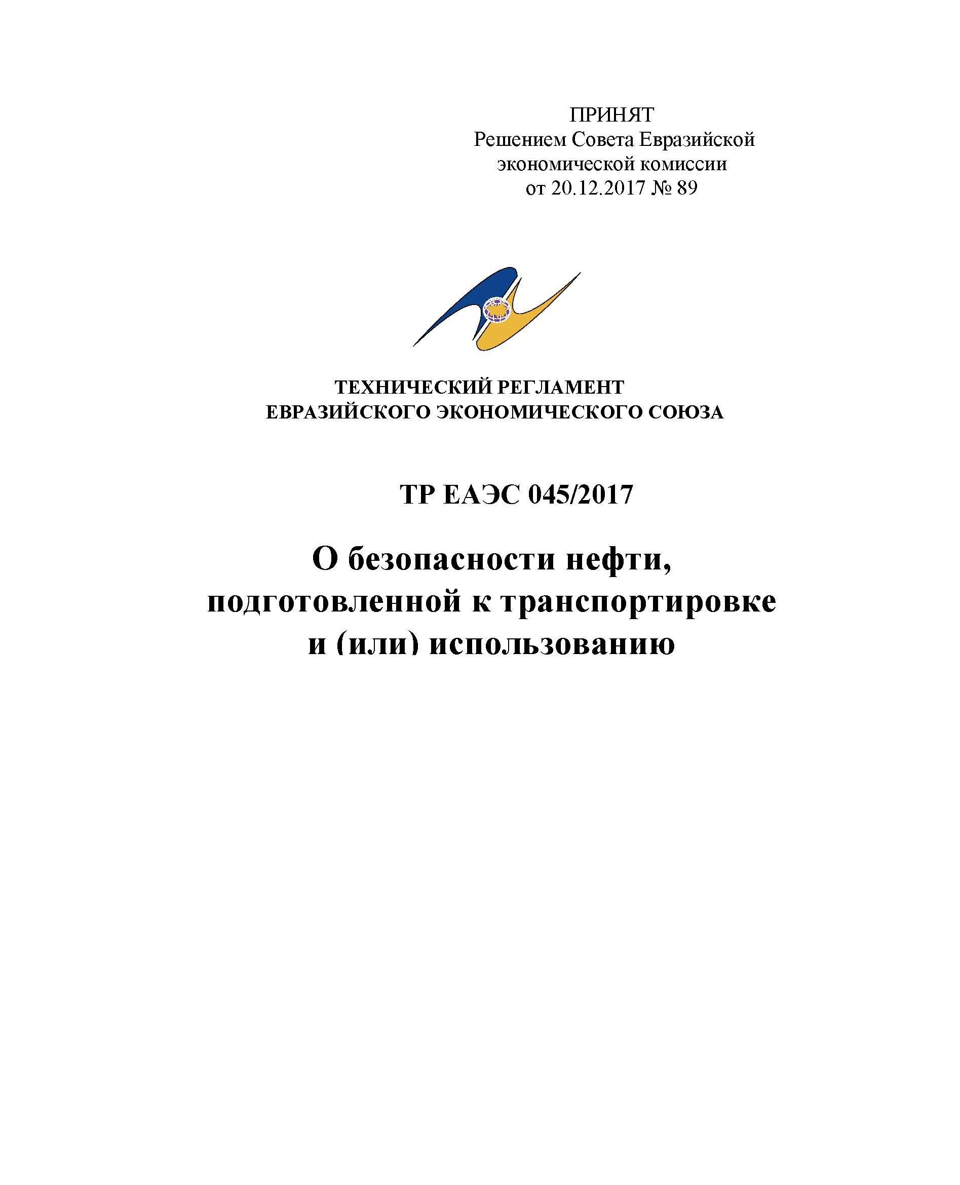 Объектом технического регулирования технического регламента ТР ЕАЭС 045/2017 является нефть, подготовленная к транспортировке и (или) использованию, выпускаемая в обращение и находящаяся в обращении на рынке Союза. Настоящий технический регламент не распространяется на нефть, поставляемую на экспорт за пределы таможенной территории Союза, поставляемую по государственному оборонному заказу, находящуюся на хранении в организациях, обеспечивающих сохранность государственного материального резерва, а также используемую изготовителем (производителем) нефти исключительно для собственных нужд. Нефть, выпускаемая в обращение и находящаяся в обращении, должна соответствовать требованиям настоящего технического регламента, а также требованиям других технических регламентов ЕАЭС, действие которых на нее распространяется.