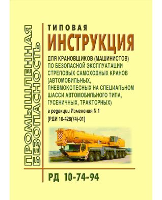 Главная/Книжные издания (Книги, брошюры)/Промышленная безопасность/Подъемные сооружения/РД 10-74-94 Типовая инструкция для крановщиков (машинистов) по безопасной эксплуатации стреловых самоходных кранов (автомобильных, пневмоколесных на специальном шасси автомобильного типа, гусеничных, тракторных). Утверждена Госгортехнадзором РФ 2 августа 1994 года в редакции Постановления Госгортехнадзора РФ от 06.12.2001 № 60