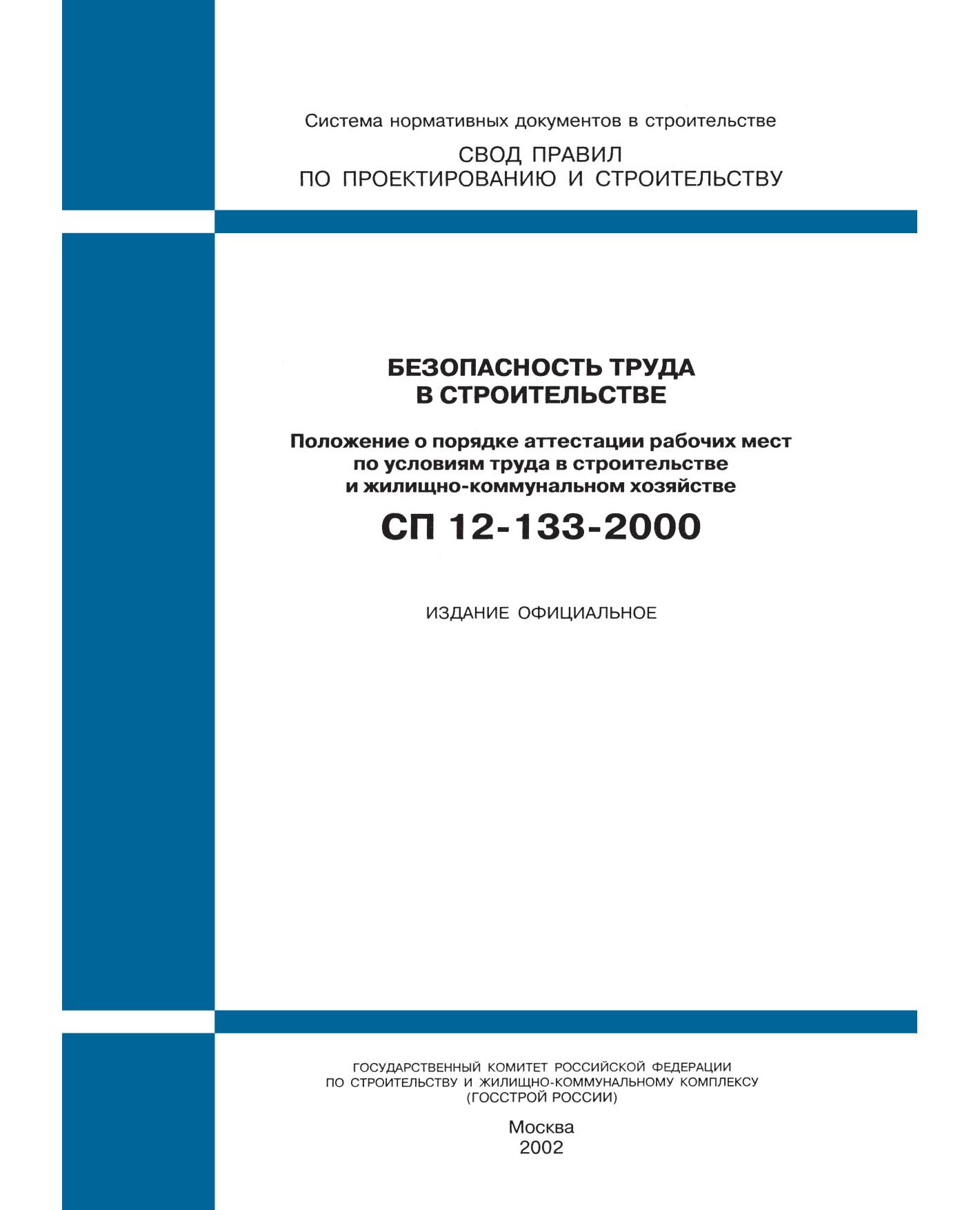 Главная/Книжные издания (Книги, брошюры)/Строительство/Охрана труда, Безопасность работ/СП 12-133-2000 (М.: Госстрой России, ГУП ЦПП, 2000) Безопасность труда в строительстве. Положение о порядке аттестации рабочих мест по условиям труда в строительстве и жилищно-коммунальном хозяйстве. Принят и введен в действие Постановлением Госстроя РФ от 31.03.2000 № 26