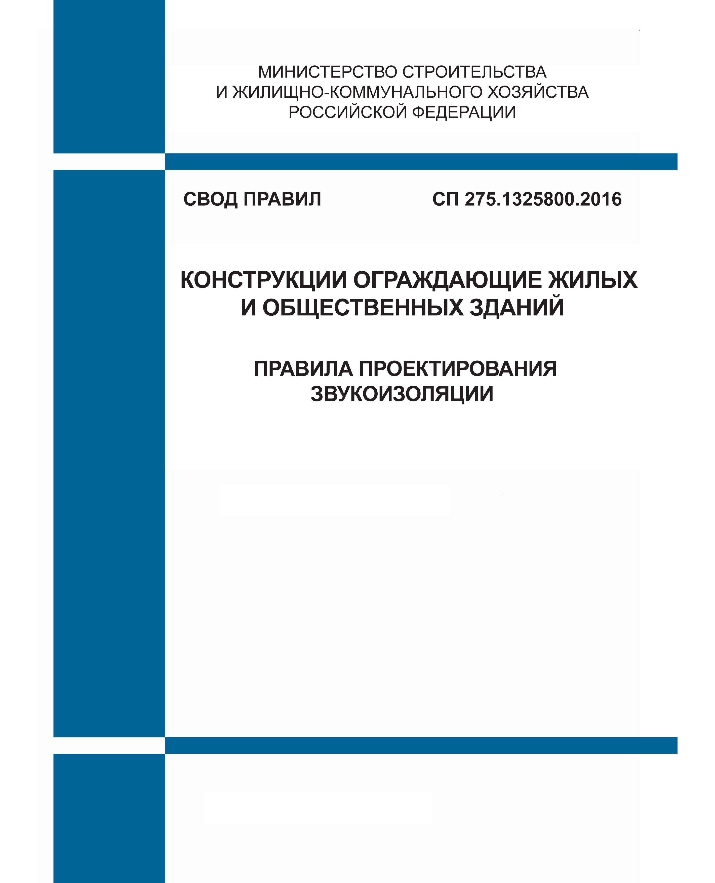 Настоящий свод правил устанавливает требования к расчету и проектированию ограждающих конструкций жилых и общественных зданий и распространяется на методы расчета звукоизоляции воздушного и ударного шума внутренними и наружными ограждающими конструкциями жилых и общественных зданий и их элементами (окна, двери, ворота и т.п.), на методы оценки соответствия звукоизоляции строительных конструкций строительным нормам, приведенным в СП 51.13330.2011. Настоящий свод правил распространяется также на методы проектирования ограждающих конструкций зданий, обеспечивающих требуемую звукоизоляцию воздушного и ударного шума и позволяющих повысить акустическую комфортность проживания, отдыха и труда населения в помещениях различного назначения.