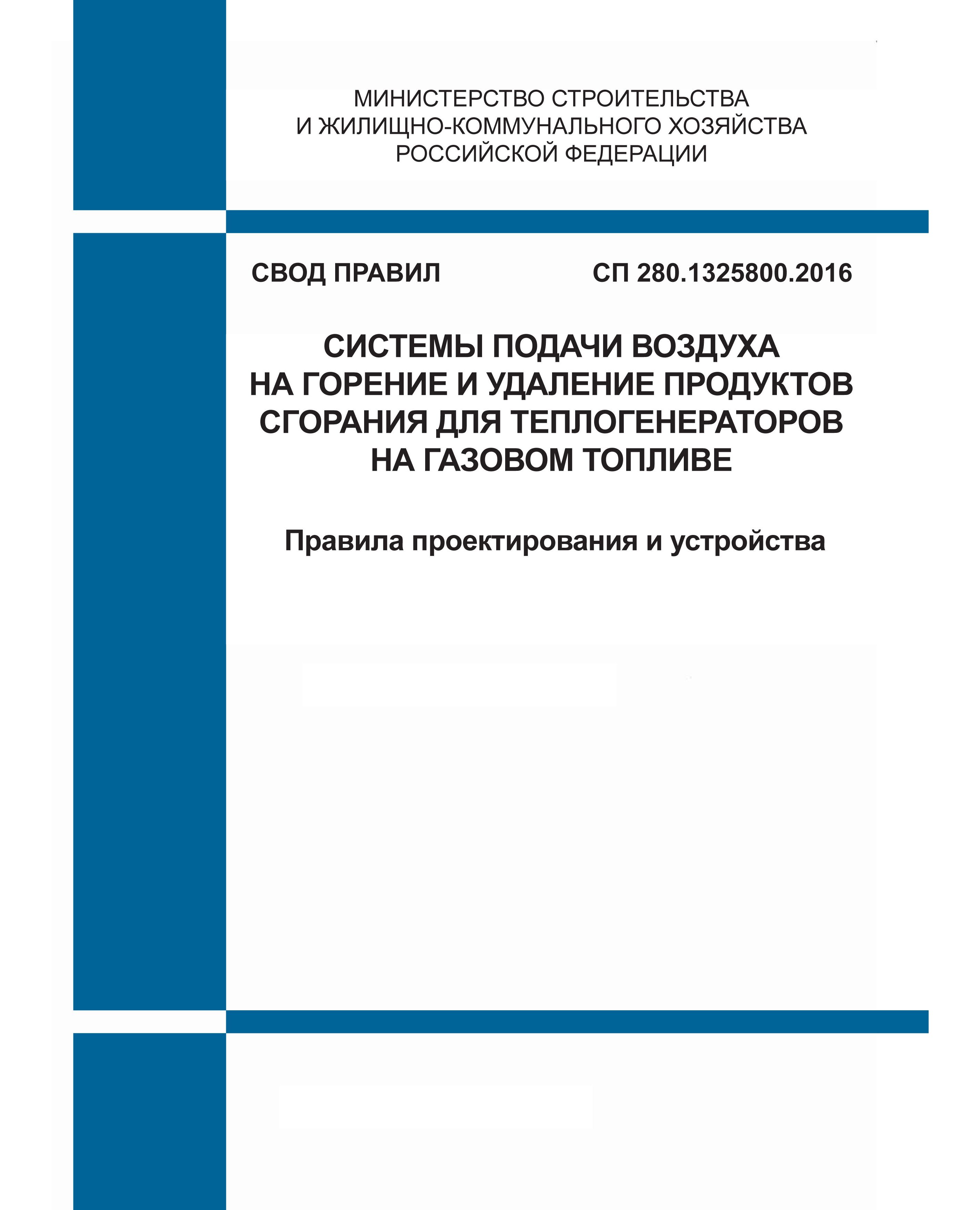 Свод правил распространяется на проектирование, строительство и эксплуатацию систем подачи воздуха на горение и удаления продуктов сгорания органического топлива для теплогенераторов на газовом топливе, устанавливаемых в квартирах новых и реконструируемых многоквартирных жилых зданий высотой до 28 м, в том числе имеющих встроенные нежилые помещения общественного назначения.
