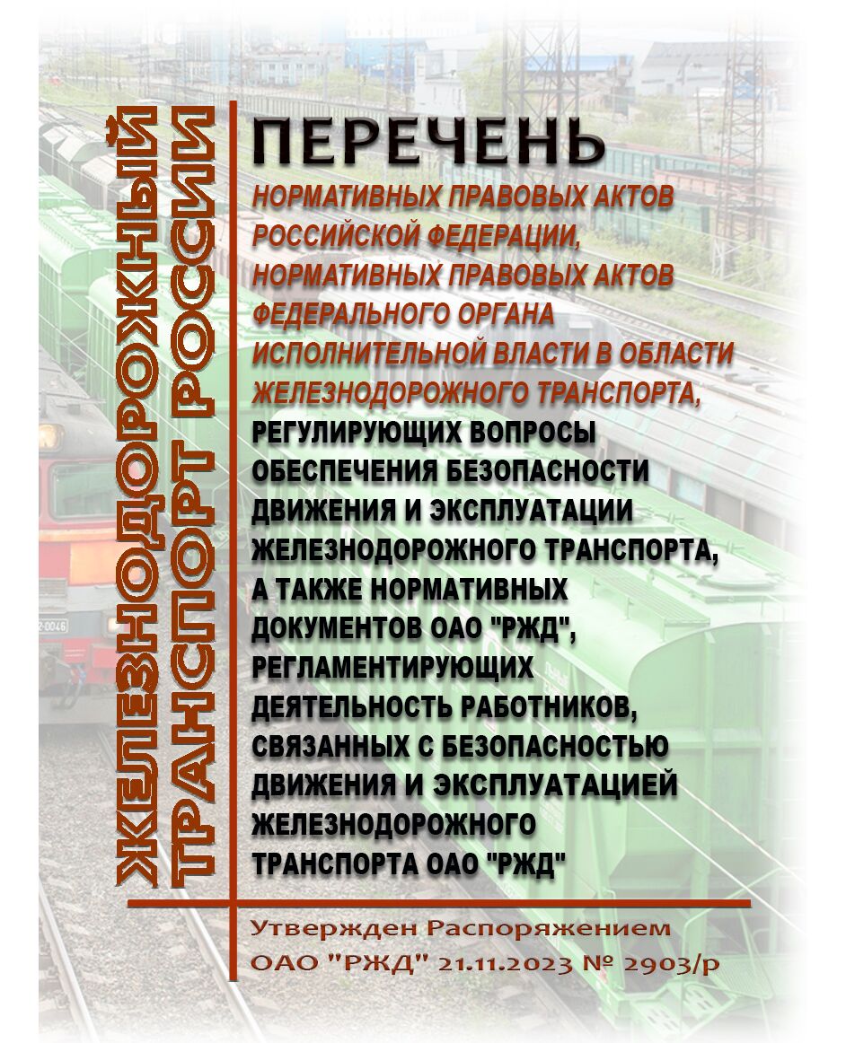 Главная/Книжные издания (Книги, брошюры)/Железнодорожный транспорт/Безопасность движения, (ЦРБ)/Перечень нормативных правовых актов Российской Федерации, нормативных правовых актов федерального органа исполнительной власти в области железнодорожного транспорта, регулирующих вопросы обеспечения безопасности движения и эксплуатации железнодорожного транспорта, а также нормативных документов ОАО "РЖД", регламентирующих деятельность работников, связанных с безопасностью движения и эксплуатацией железнодорожного транспорта ОАО "РЖД". Утвержден Распоряжением ОАО "РЖД" от 21.11.2023 № 2903/р в редакции Распоряжения ОАО "РЖД" от 31.01.2024 № 248/р