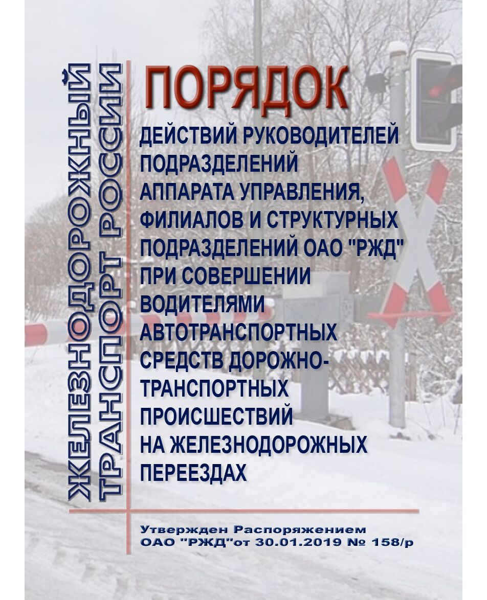 Главная/Книжные издания (Книги, брошюры)/Железнодорожный транспорт/Безопасность движения, (ЦРБ)/Порядок действий руководителей подразделений аппарата управления, филиалов и структурных подразделений ОАО "РЖД" при совершении водителями автотранспортных средств дорожно-транспортных происшествий на железнодорожных переездах. Утвержден Распоряжением ОАО "РЖД" от 30.01.2019 № 158/р