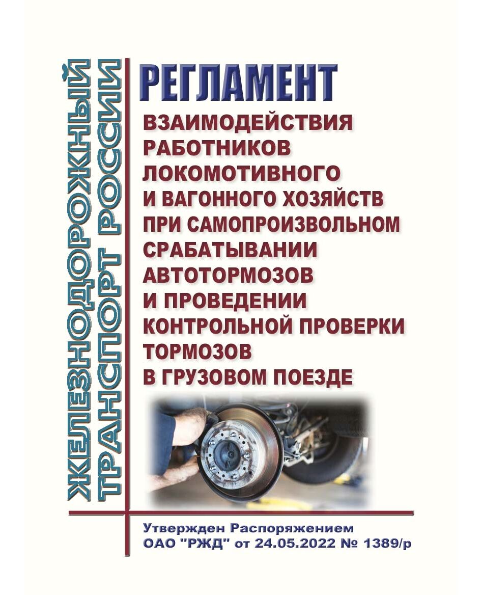 Регламент взаимодействия работников локомотивного и вагонного хозяйств при самопроизвольном срабатывании автотормозов и проведении контрольной проверки тормозов в грузовом поезде. Утвержден Распоряжением ОАО "РЖД" от 24.05.2022 № 1389/р