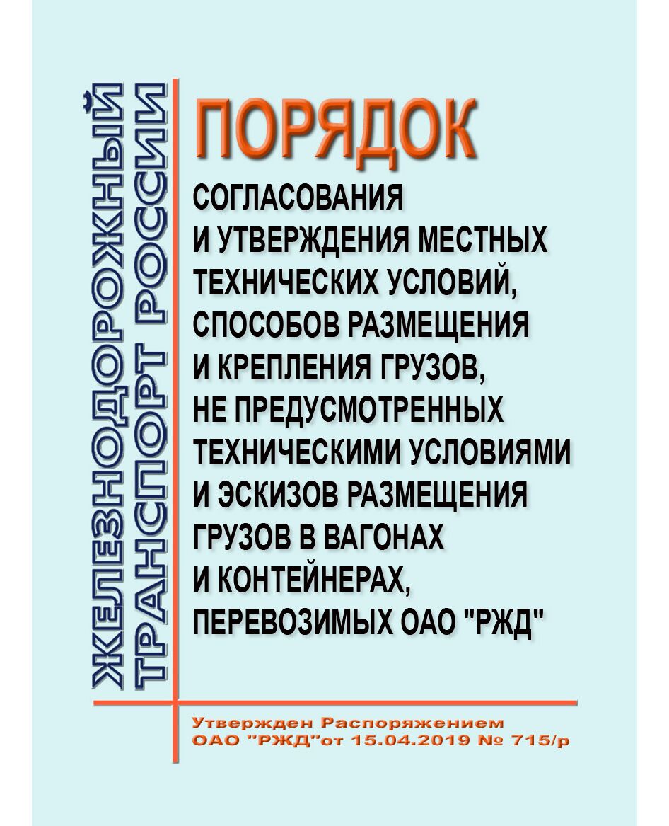 Взамен Распоряжения ОАО "РЖД" от 22.08.2016 № 1699р "Об утверждении Порядка согласования и утверждения местных технических условий, способов, не предусмотренных техническими условиями, и эскизов размещения и крепления грузов в вагонах и контейнерах, перевозимых ОАО "РЖД".