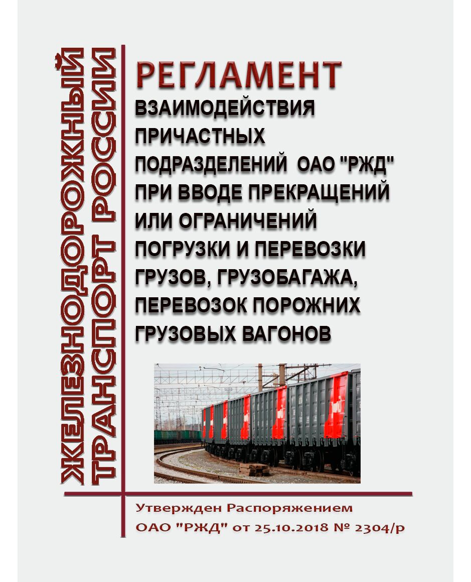 Регламент определяет порядок взаимодействия причастных подразделений ОАО "РЖД" при вводе прекращений или ограничений погрузки и перевозки грузов, грузобагажа, перевозок порожних грузовых вагонов (далее - ограничение) в соответствии с положениями статьи 29 Федерального закона "Устав железнодорожного транспорта Российской Федерации" от 10 января 2003 г. № 18-ФЗ.