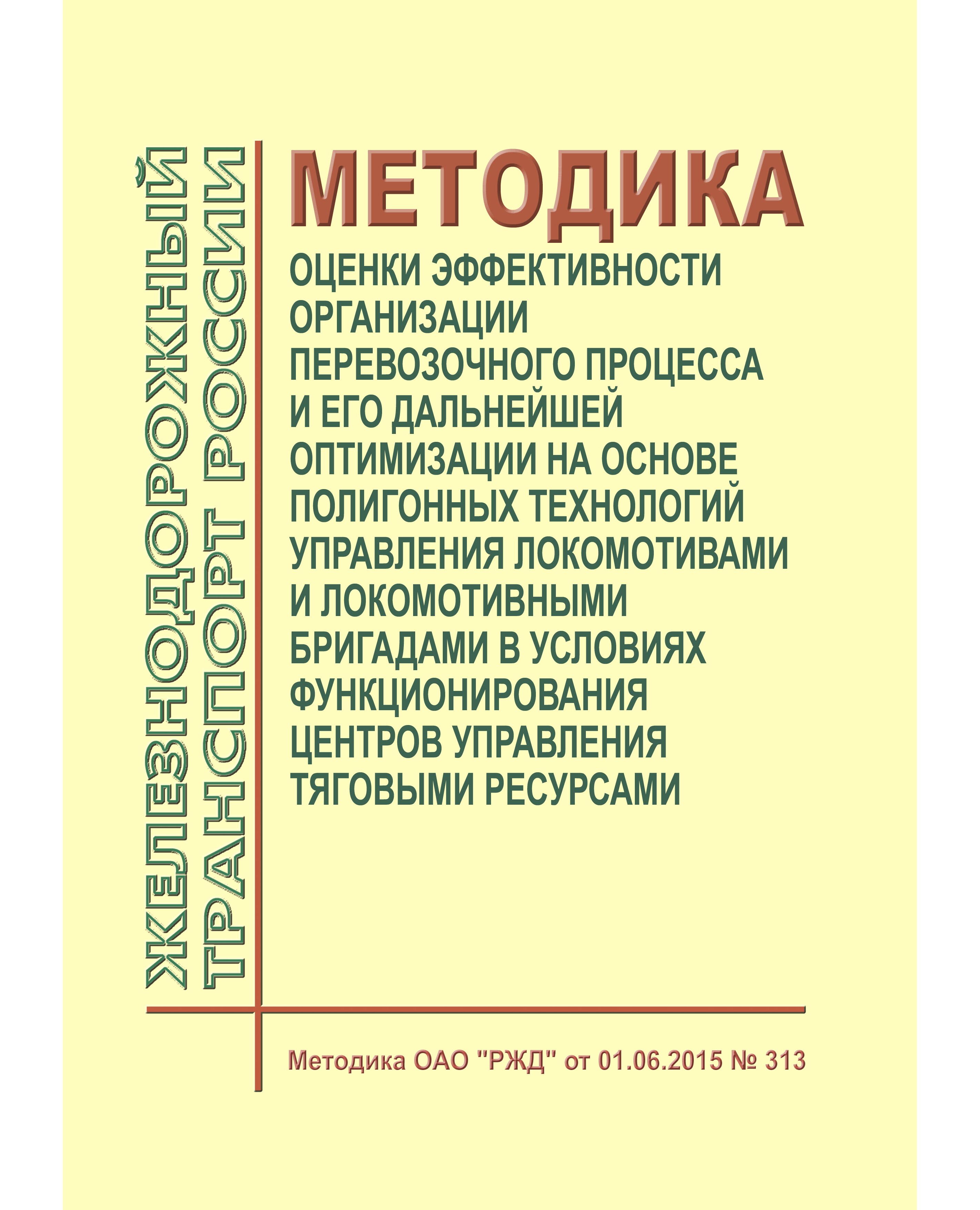 Методика оценки эффективности организации перевозочного процесса и его дальнейшей оптимизации на основе полигонных технологий управления локомотивами и локомотивными бригадами в условиях функционирования центров управления тяговыми ресурсами. Методика ОАО "РЖД" от 01.06.2015 № 313