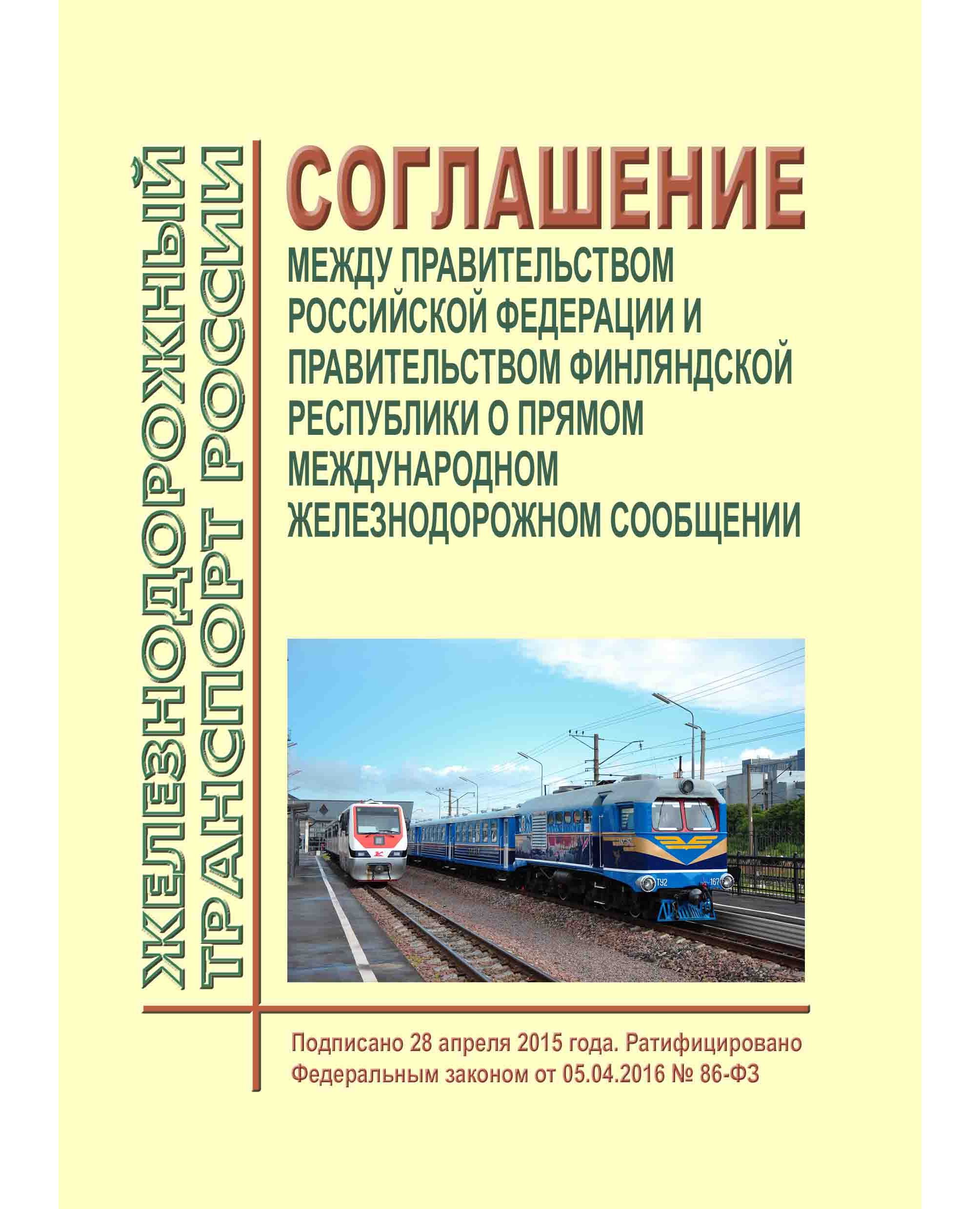 Соглашение между Правительством Российской Федерации и Правительством Финляндской Республики о прямом международном железнодорожном сообщении. Подписано 28 апреля 2015 года. Ратифицировано Федеральным законом от 05.04.2016 № 86-ФЗ