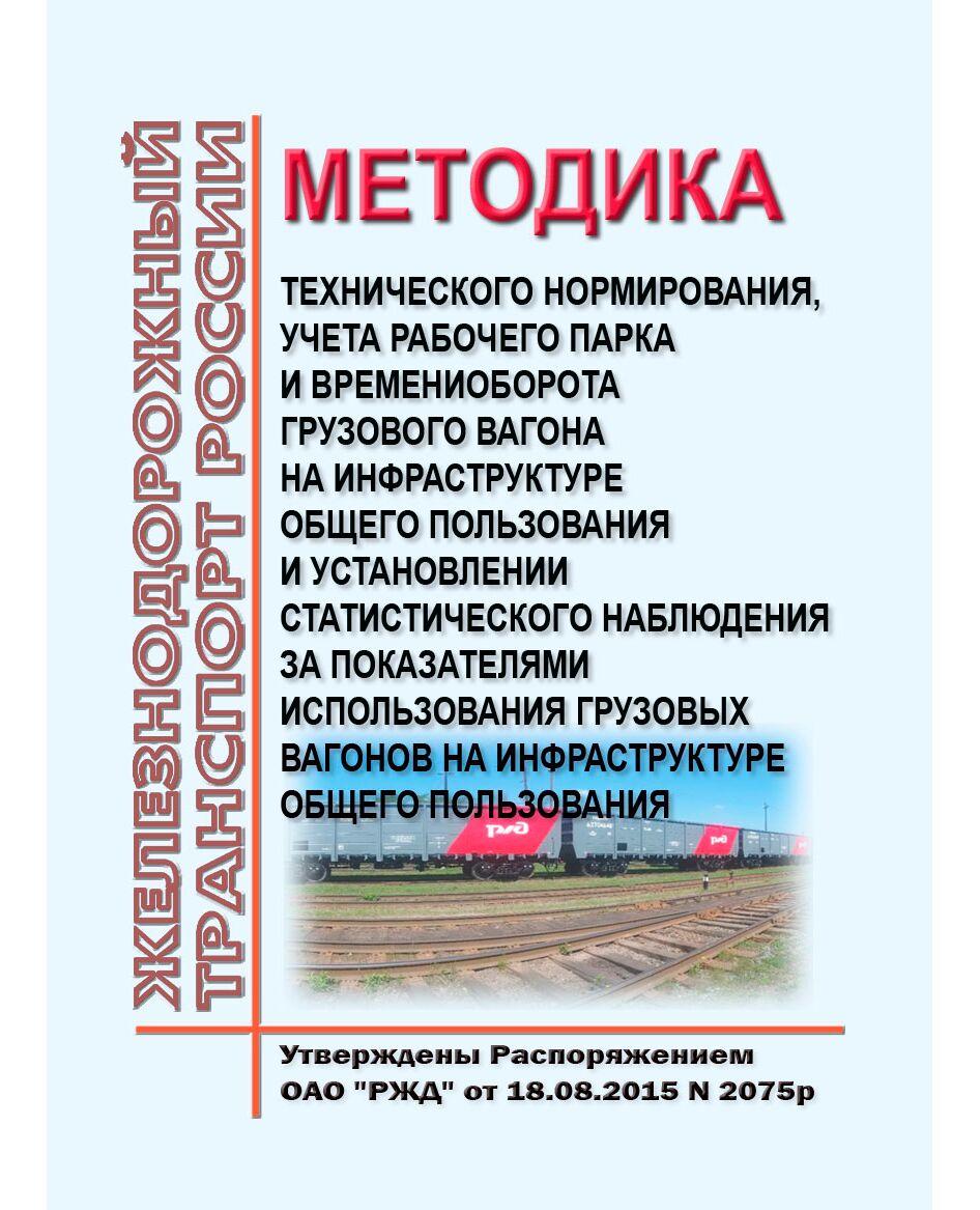 Главная/Книжные издания (Книги, брошюры)/Железнодорожный транспорт/Инфраструктура, Общие положения, (ЦДИ)/Методика технического нормирования, учета рабочего парка и времени оборота грузового вагона на инфраструктуре общего пользования и установлении статистического наблюдения за показателями использования грузовых вагонов на инфраструктуре общего пользования. Утверждена Распоряжением ОАО "РЖД" от 18.08.2015 N 2075р