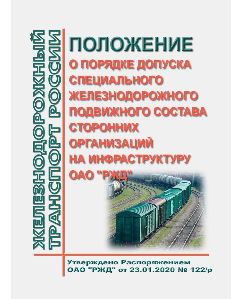 Положение о порядке допуска специального железнодорожного подвижного состава сторонних организаций на инфраструктуру ОАО "РЖД". Утверждено Распоряжением ОАО "РЖД" от 23.01.2020 № 122/р в редакции Распоряжения ОАО "РЖД" от 07.06.2022 № 1505/р