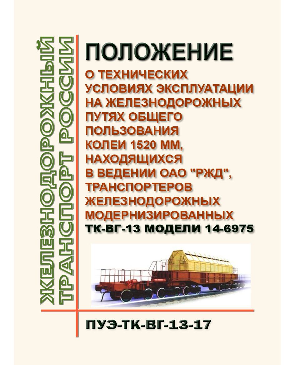 Положение о технических условиях эксплуатации на железнодорожных путях общего пользования колеи 1520 мм, находящихся в ведении ОАО "РЖД", транспортеров модели 14-6975 устанавливает правила безопасной эксплуатации транспортеров железнодорожных модернизированных ТК-ВГ-13 модели 14-6975
