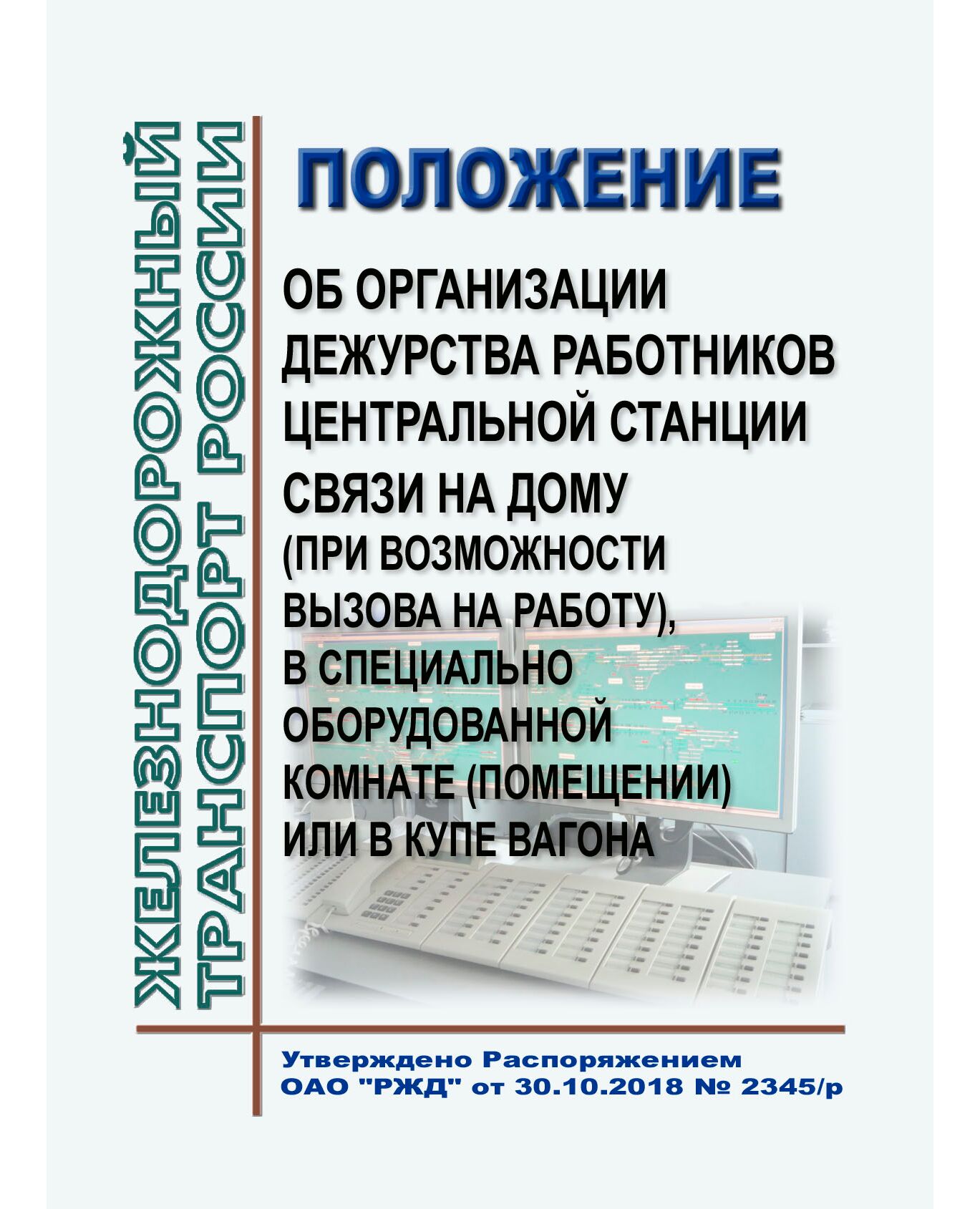 Взамен распоряжение ОАО "РЖД" от 18 октября 2010 г. N 2155р "Об утверждении Положения о порядке и условиях организации дежурства на дому (при возможности вызова на работу) или с правом отдыха в специально оборудованной комнате (помещении) работников Центральной станции связи".
