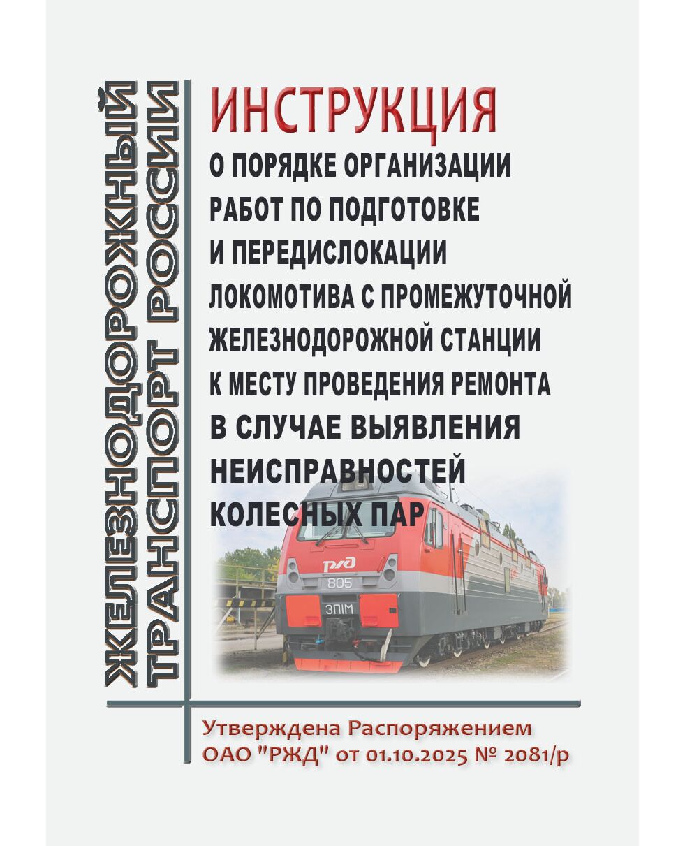 Инструкция о порядке организации работ по подготовке и передислокации локомотива с промежуточной железнодорожной станции к месту проведения ремонта в случае выявления неисправностей колесных пар. Утверждена Распоряжением ОАО "РЖД" от 01.10.2025 № 2081/р