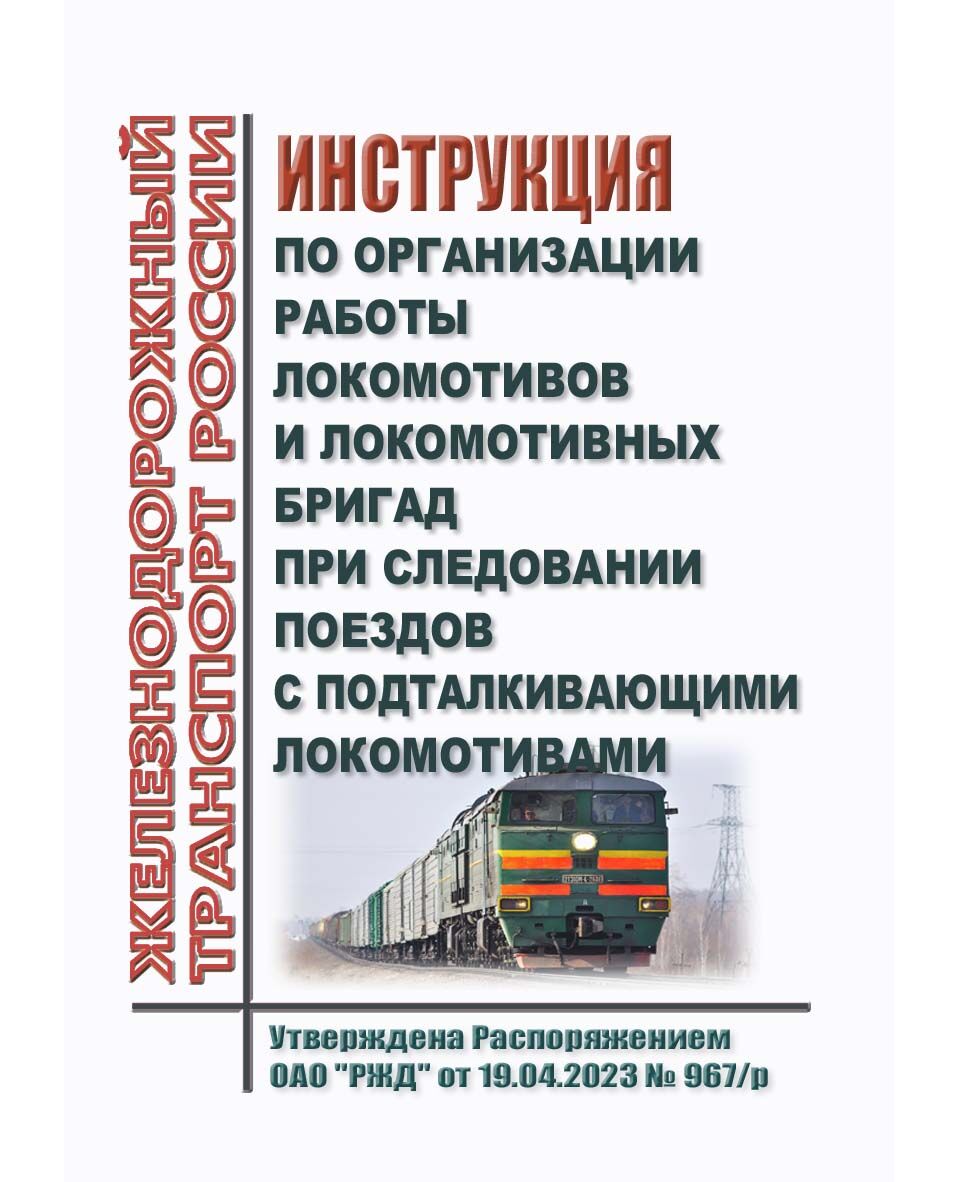 Инструкция по организации работы локомотивов и локомотивных бригад при следовании поездов с подталкивающими локомотивами устанавливает порядок использования локомотивов при подталкивании, назначение и особенности работы локомотивных бригад (в том числе машинистов, работающих без помощников), а также взаимодействие локомотивных бригад ведущего и подталкивающего локомотивов как между собой, так и с работниками дирекций управления движением, дирекций инфраструктуры и работниками Трансэнерго на инфраструктуре ОАО "РЖД".