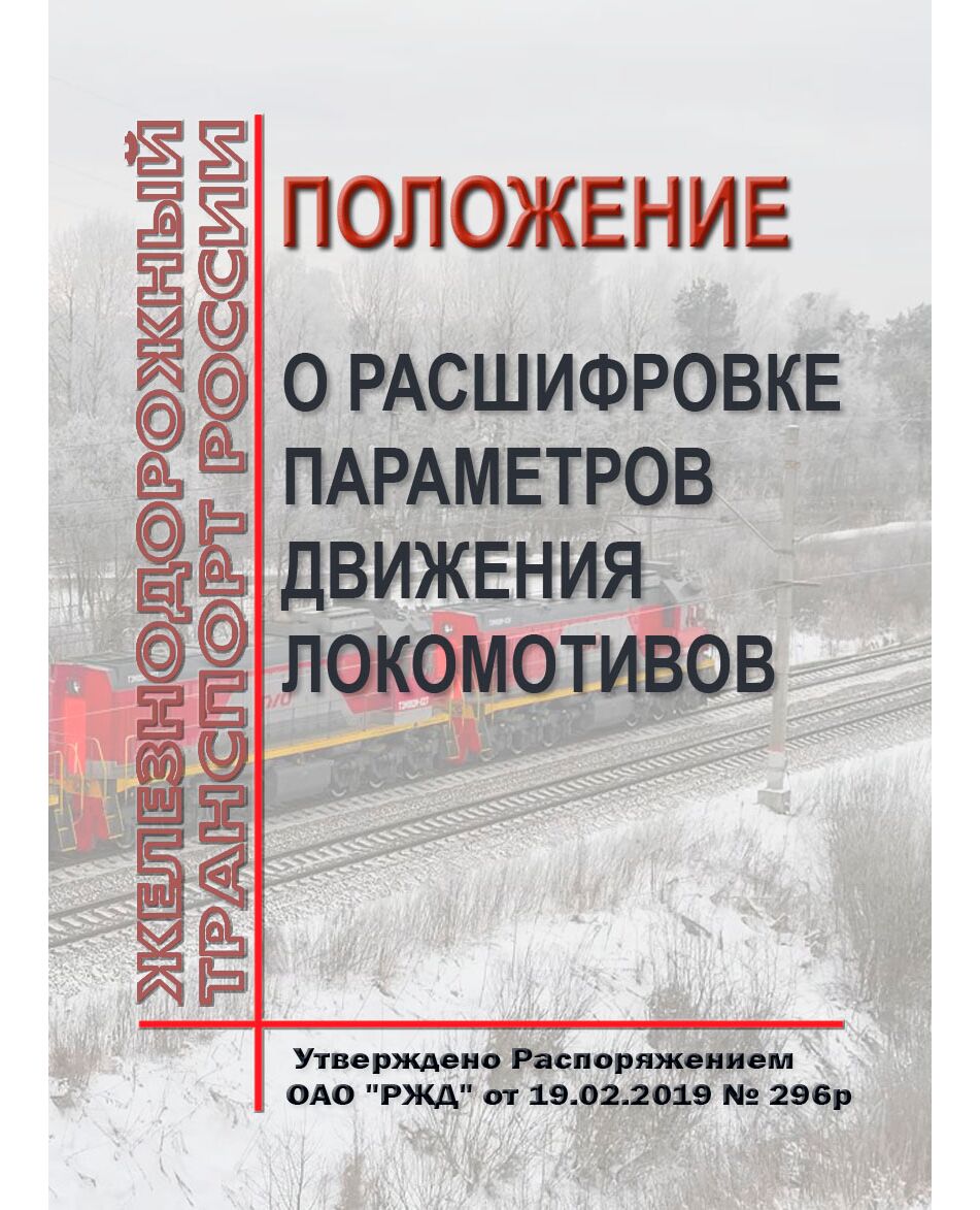 Распоряжением ОАО "РЖД" от 19.02.2019 № 296р признан утратившим силу с 1 марта 2019 г. Распоряжение ОАО "РЖД" от 04.12.2014 № 2849р "Об утверждении Положения об организации расшифровки параметров движения локомотива, моторвагонного подвижного состава эксплуатационного локомотивного (моторвагонного) депо".