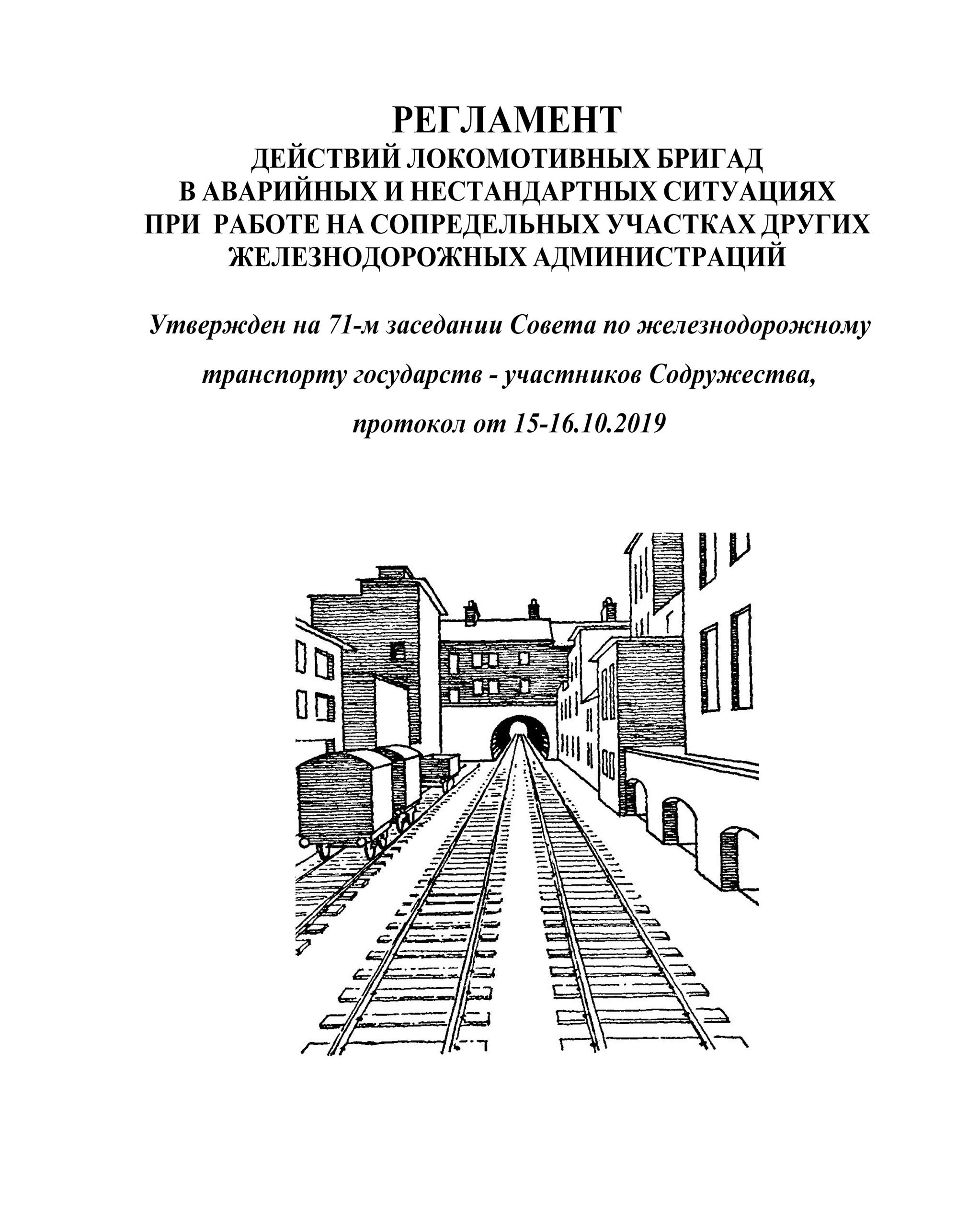Главная/Книжные издания (Книги, брошюры)/Железнодорожный транспорт/Локомотивы и локомотивное хозяйство, (ЦТ, ЦТР)/Регламент действий локомотивных бригад в аварийных и нестандартных ситуациях при работе на сопредельных участках других железнодорожных администраций. Утвержден на 71-м заседании Совета по железнодорожному транспорту государств - участников Содружества, протокол от 15-16.10.2019 г. с изм. и доп., утв. на 74-м заседании СЖТ СНГ, протокол от 08.06.2021 г.