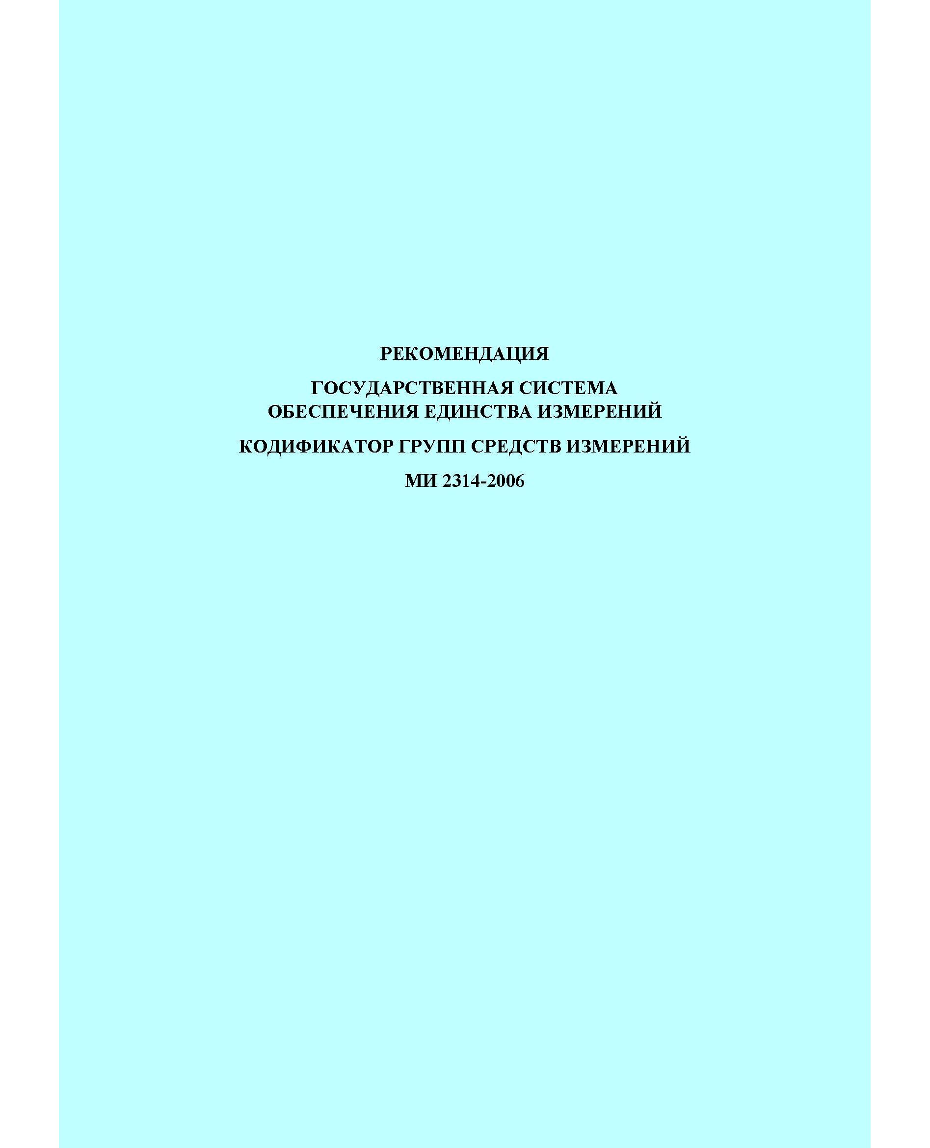 МИ 2314-2006. Рекомендация. Государственная система обеспечения единства измерений. Кодификатор групп средств измерений. Утверждена и введена в действие ФГУП «ВНИИМС» 18 мая 2006 г.