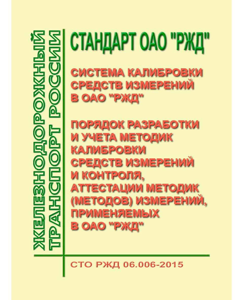 Главная/Книжные издания (Книги, брошюры)/Железнодорожный транспорт/Метрология/Стандарт ОАО "РЖД". Система калибровки средств измерений в ОАО "РЖД". Порядок разработки и учета методик калибровки средств измерений и контроля, аттестации методик (методов) измерений, применяемых в ОАО "РЖД". СТО РЖД 06.006-2015. Утвержден Распоряжение ОАО "РЖД" от 30.12.2015 № 3157р